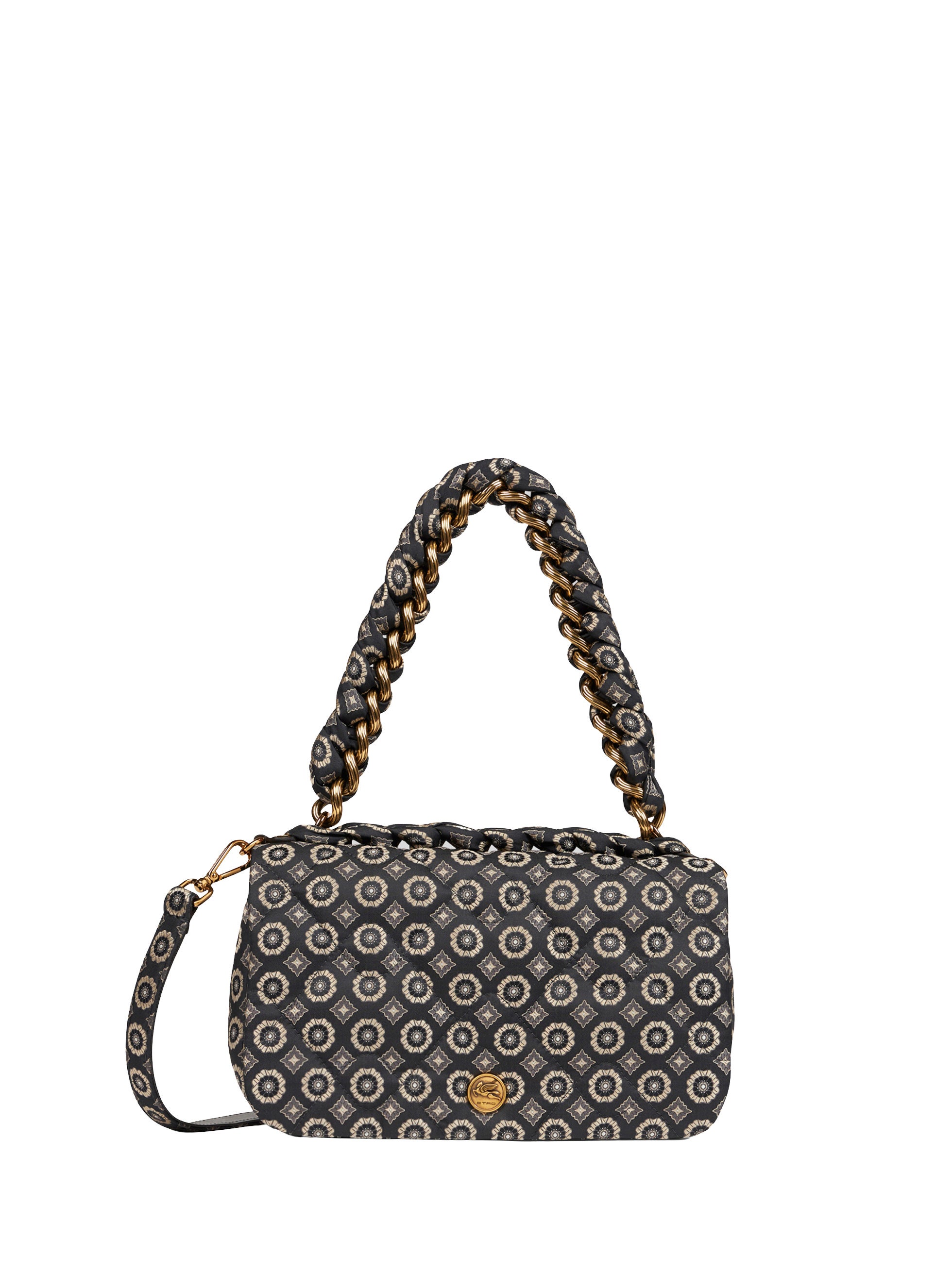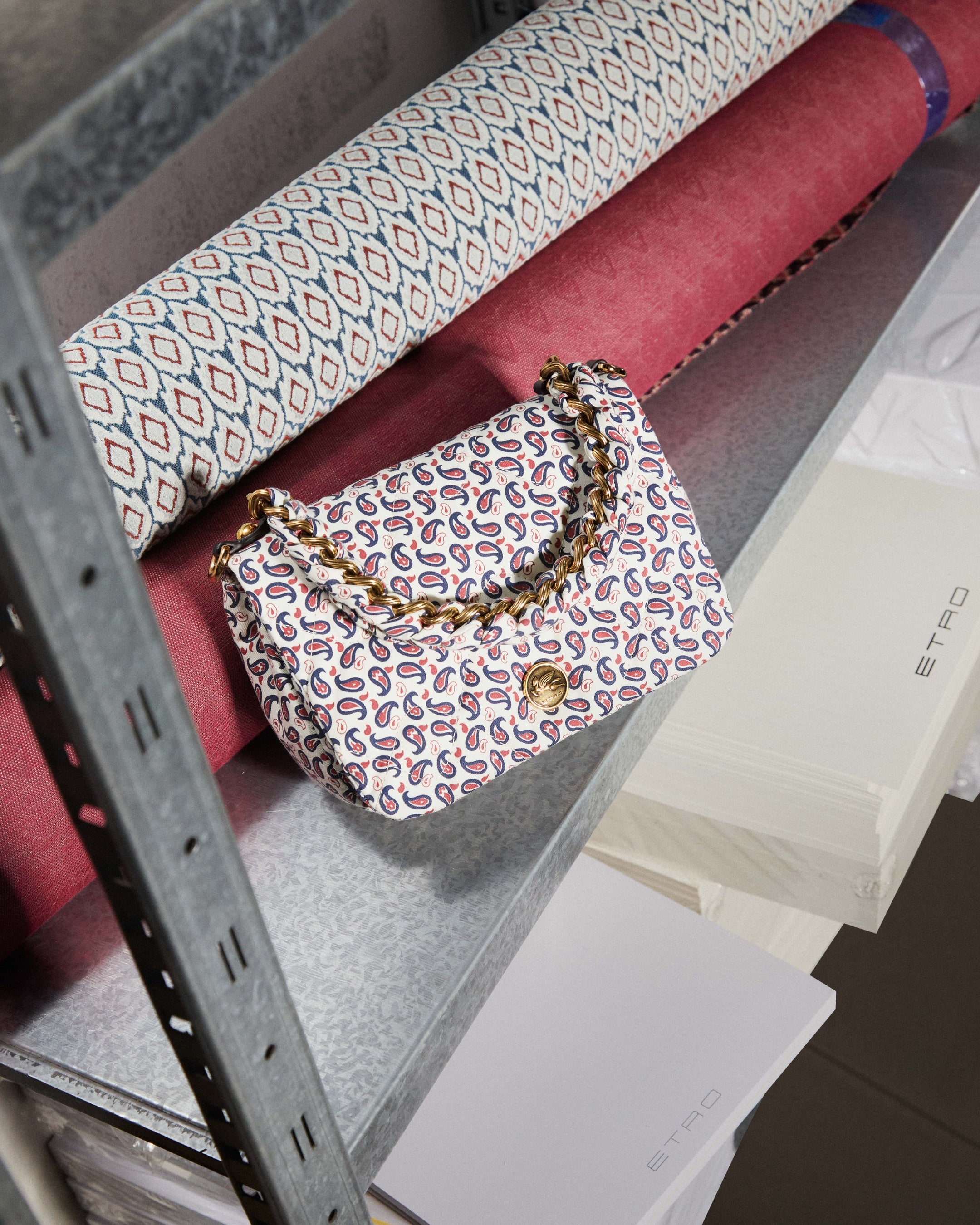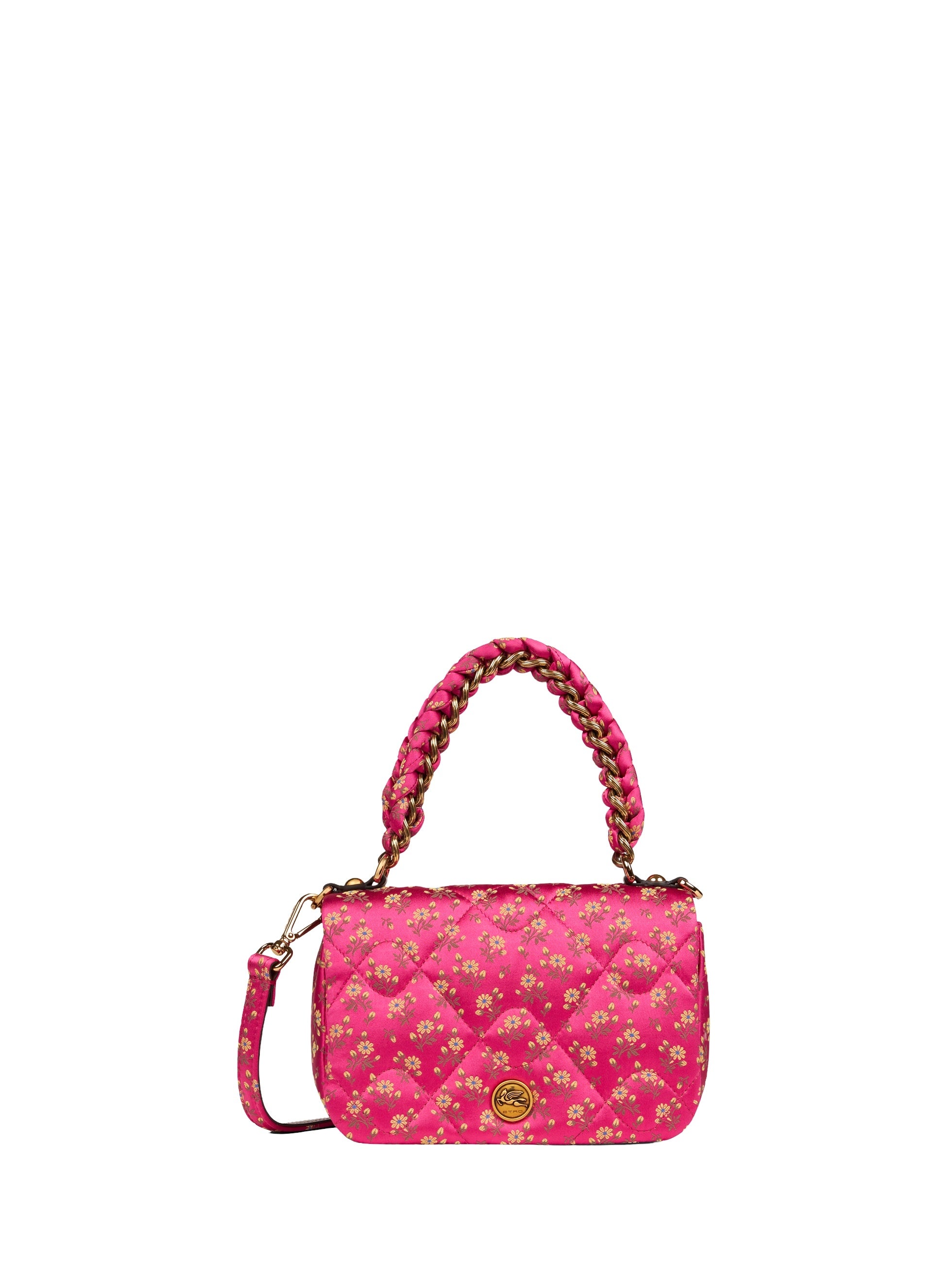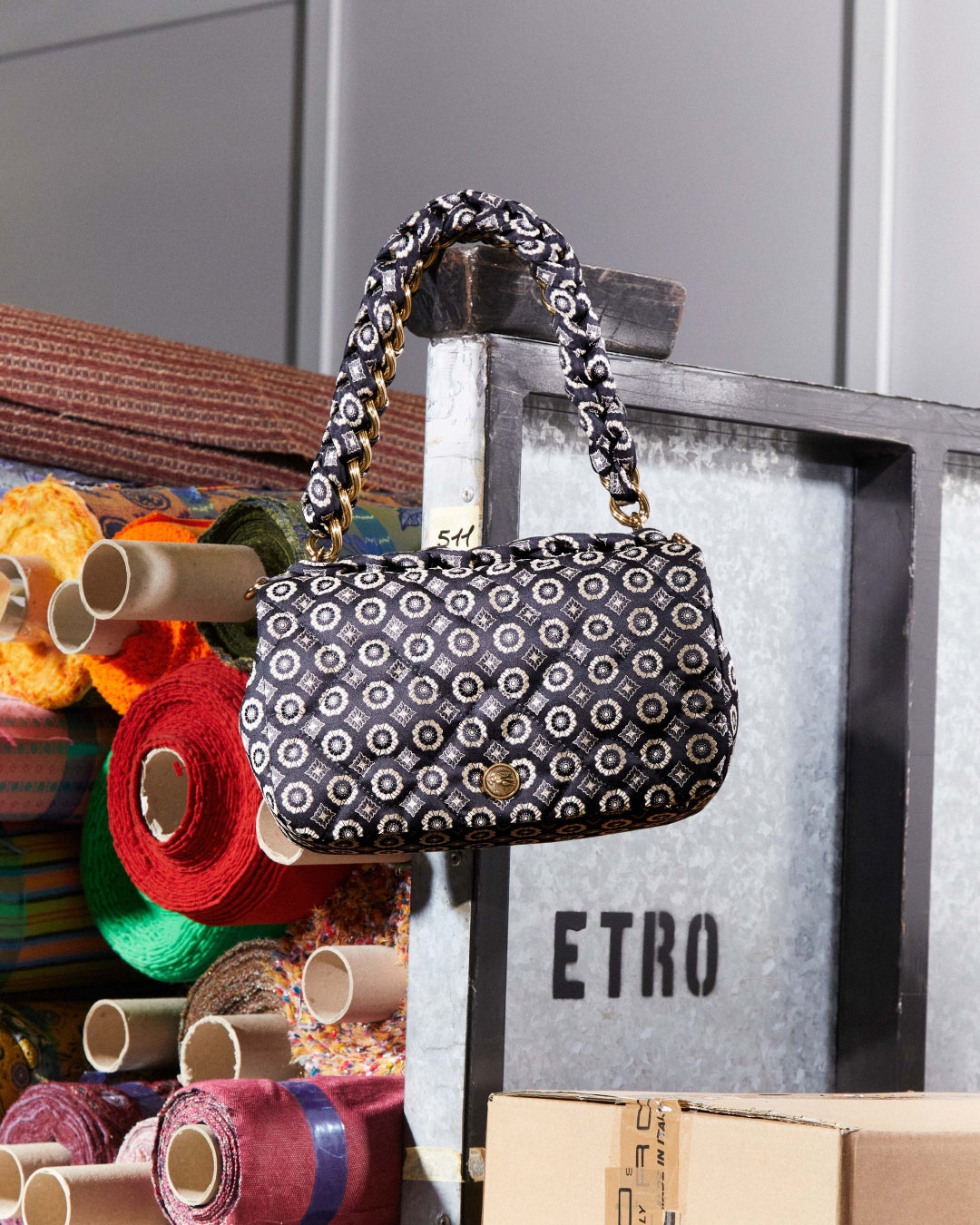 エトロのシンボルモチーフであるペガソの刺繍が特徴のラブトロッターは、繊細なフラワーモチーフをジャカード織で描いています。一方、エトロボンドは、柔らかなキルティングが作るシルエットに、ファブリックが編み込まれたチェーンストラップがアクセント。