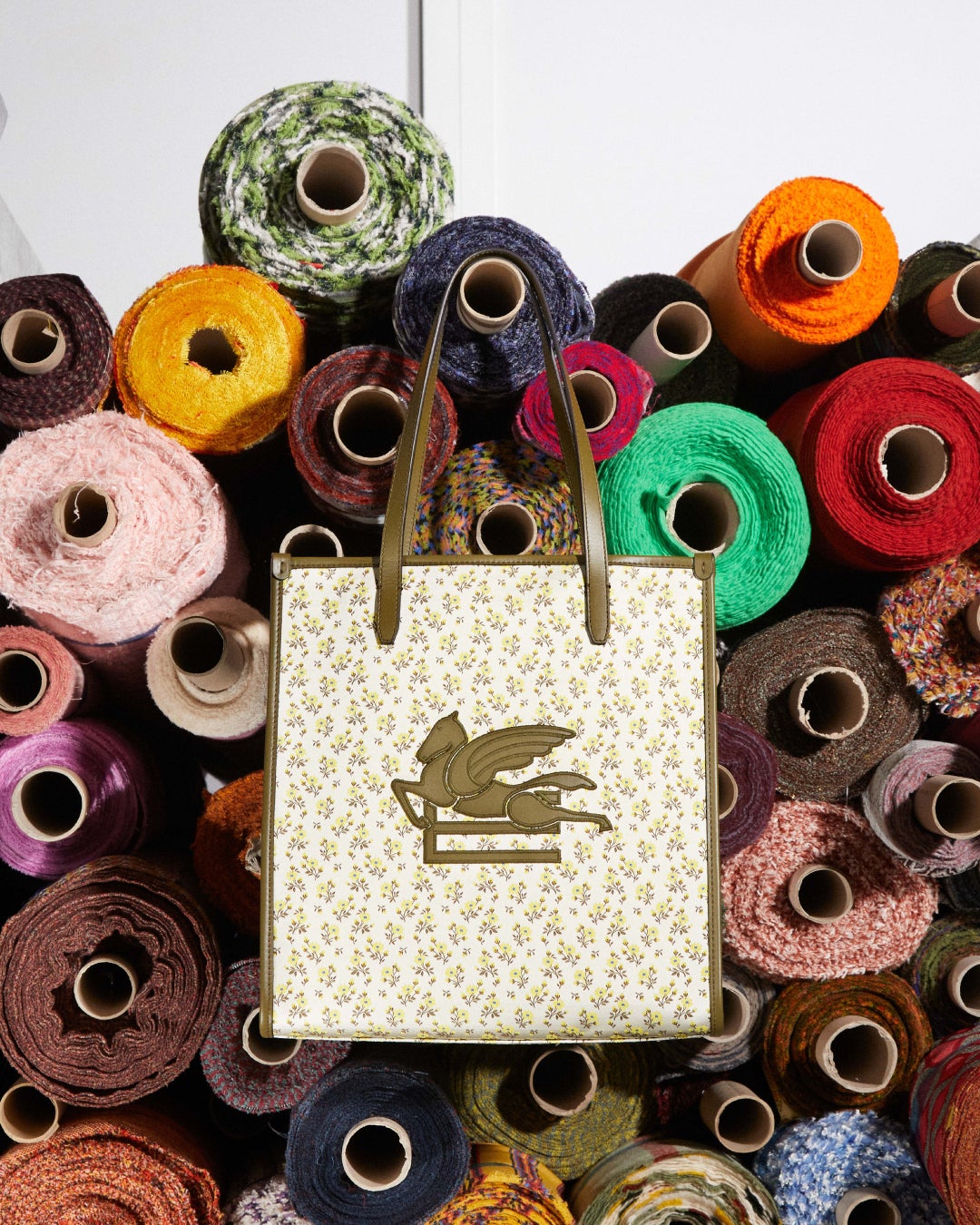 今回のポップアップストアのために、エトロのアーカイブにある厳選されたデッドストック生地を使い、アイコンバッグ「ラブトロッター」と「エトロボンド」を特別にデザインしました。消費を極力減らし、メゾンのクラフツマンシップにより、リサイクル可能な素材をクリエイティブに再活用するというコンセプトです。エトロのDNAとヘリテージを映しだす春のフラワーモチーフ、マイクロパターンのネクタイモチーフ、伝統的なペイズリー柄は、ブランドの歴史とルーツにオマージュを捧げています。