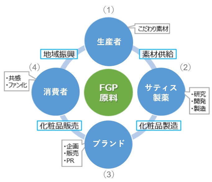 (1)地域産品がもつ固有の価値に、(2)化粧品製造会社の技術力を掛け合わせて化粧品原料化。さらに、(3)化粧品ブランドが、原料を配合した製品のPRを通じて、機能的価値だけでない原料のストーリーを伝える。そこに、(4)消費者の評価が加わる。