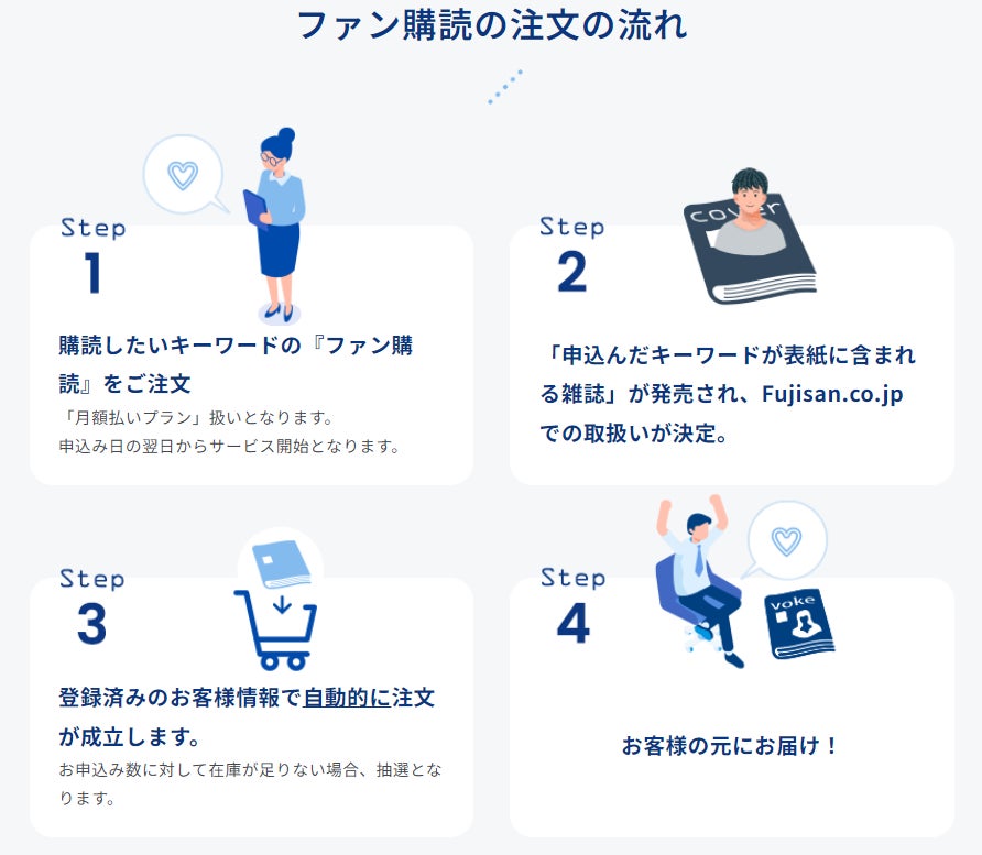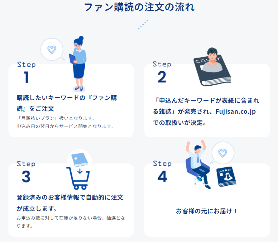「ファン購読」は、ファンの方が“好き”の対象をキーワードとして申し込むことにより雑誌を購読できる新サービスです。富士山マガジンサービスが集める表紙情報をもとに、申し込んだキーワードが表紙に含まれる雑誌の発売が決定すると、自動で注文され手元に届きます。自動注文により、発売情報を追いかけて毎回予約や購入手続きをする必要がなく、買い逃しを減らすこともできます。横断的な雑誌購読が可能になり、「推し活」の一部としても活用いただけます。