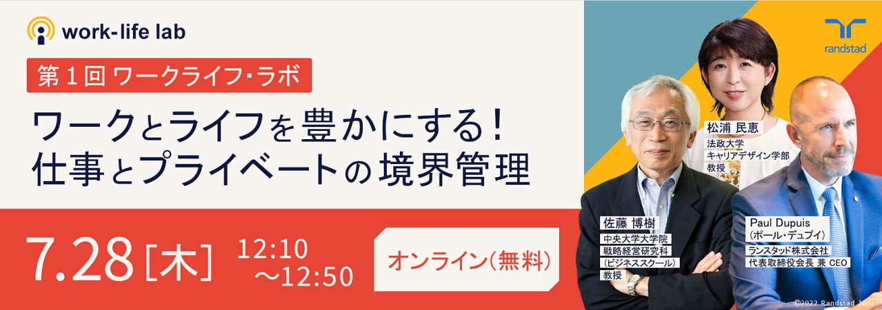 ランスタッド株式会社 新時代のワークライフを研究する「ワークライフ・ラボ」を開設。第1回無料ウェビナー「ワークとライフを豊かにする!仕事とプライベートの境界管理」を7月28日(木)ランチタイムに開催。