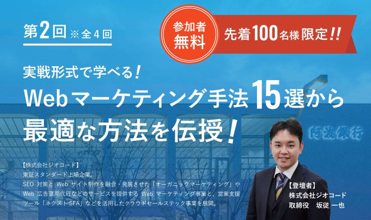 阿波銀行が7月20日に開催するセミナー「実践形式で学べる!Webマーケティング手法15選から最適な方法を伝授!」にジオコード取締役の坂従が講師登壇