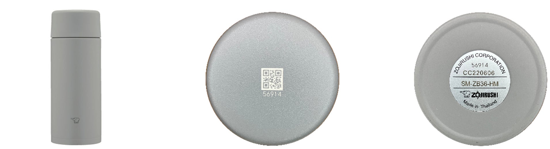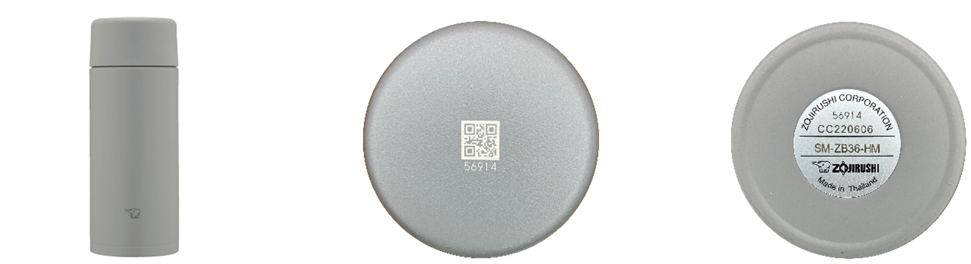 シームレスせんを採用したステンレスボトル「SM-ZB36」をベースに、ふた(天面)にボトル№と二次元コードを、本体底面にはボトル№を印字しています。