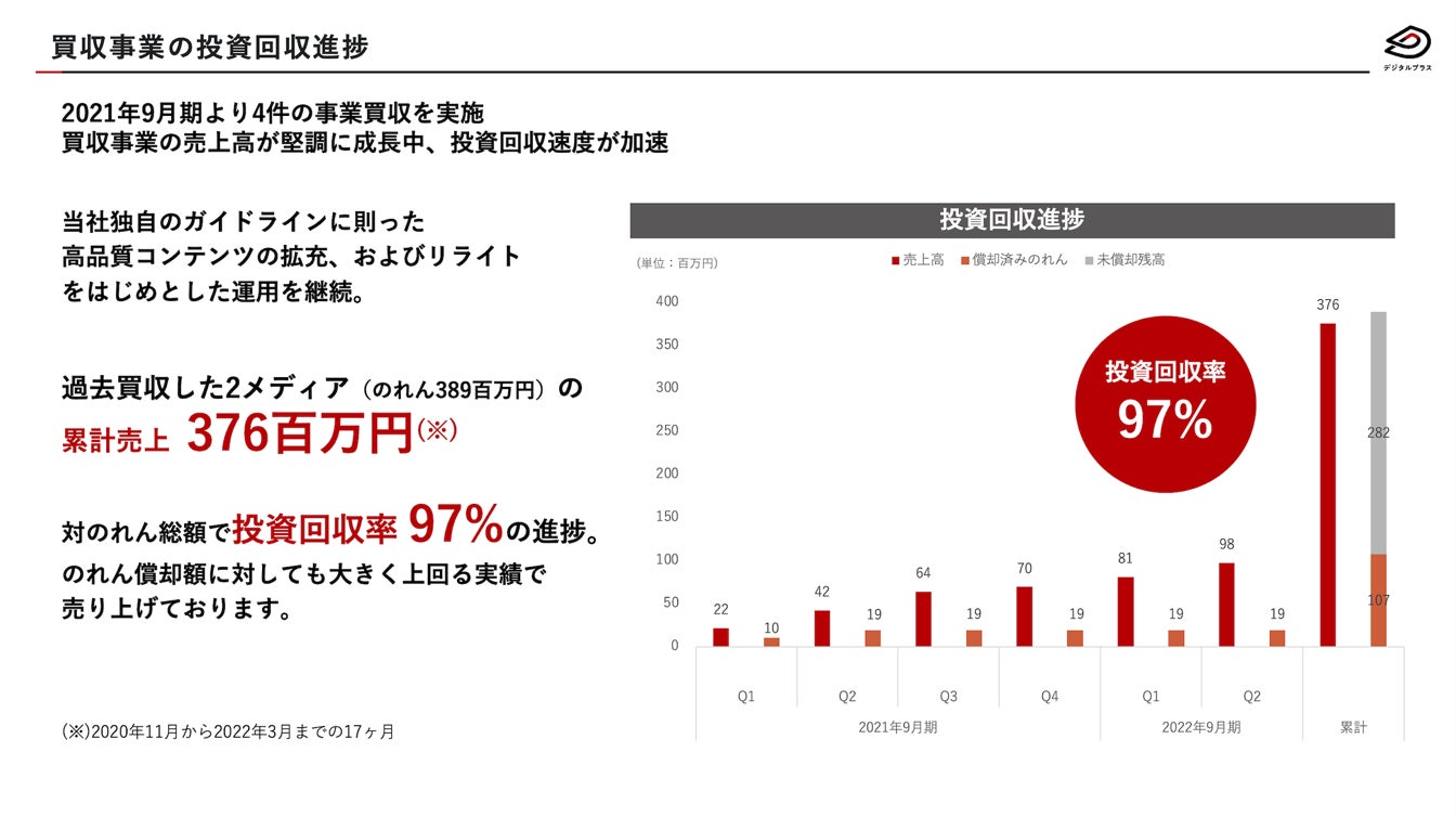 過去買収を実施した2メディアへの投資回収進捗としては、現在累計売上総額で376百万円・のれん全体の金額に対して97%の回収が完了しており、早期回収が見込まれる現状でございます。