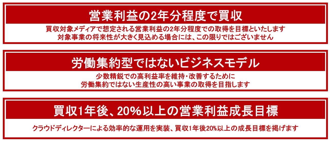 また、今後は、WEBメディアに限らず、WEBメディア運用ノウハウ・少数精鋭での事業運用体制とのシナジーが創出可能な、高利益率を実現できるWEBサービス全般を対象に買収の検討を進めてまいります。