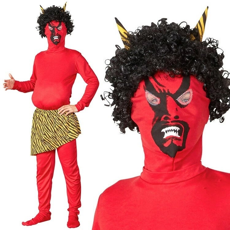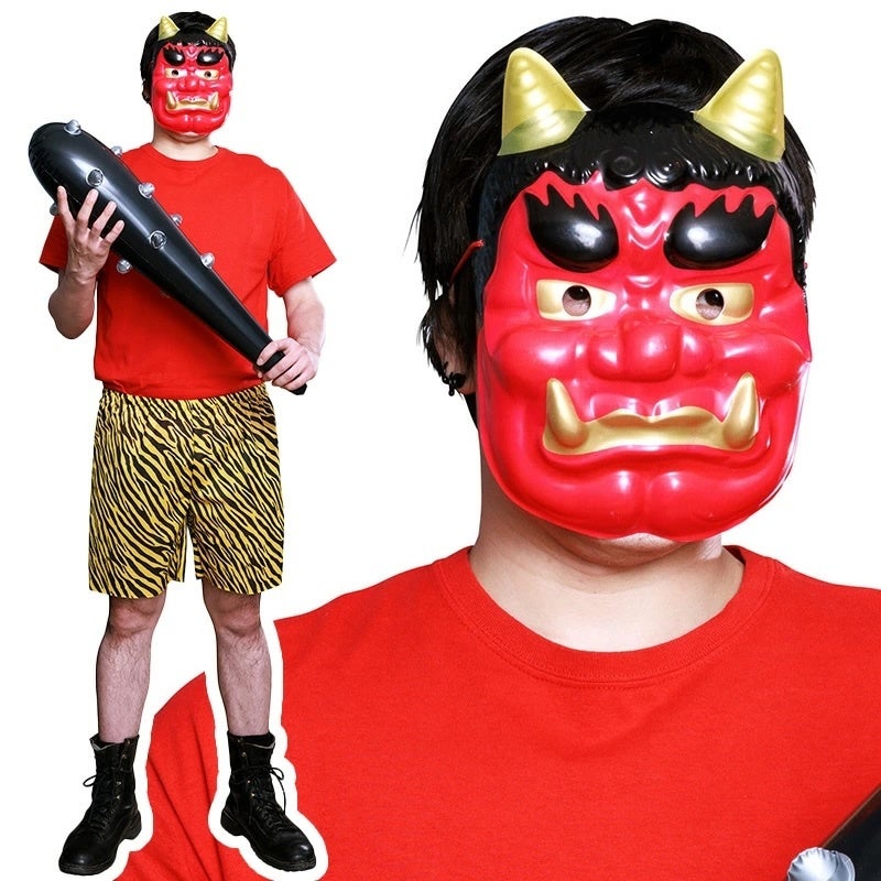 赤い全身タイツとリアルな鬼面が本格的で、子どもも大人も驚く仕上がりです〜