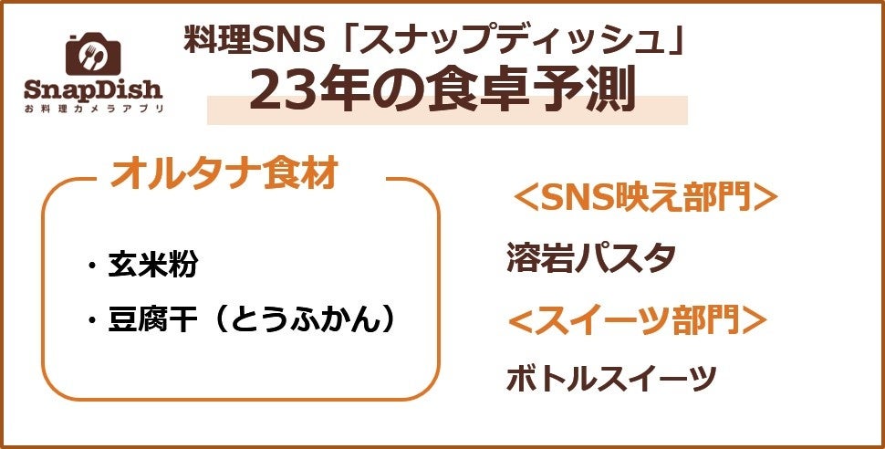 2022年1月1日~2022年11月20日のスナップディッシュユーザーの食卓投稿の中から、2021年と比較して増加しているキーワードの出現投稿数、それらの投稿へのコメント数、いいね数、シェア数等のリアクションデータをもとに、スナップディッシュ編集部が選考し、決定しています。