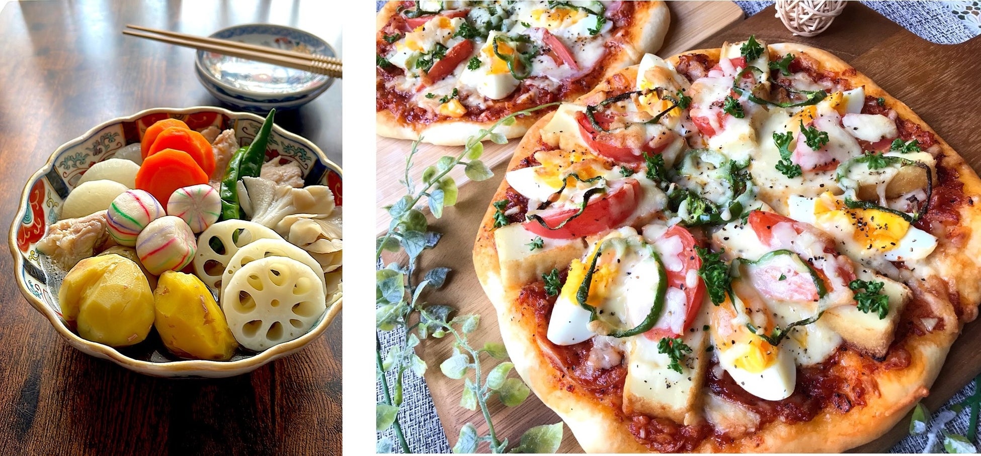 右:厚揚げとトマトとゆで卵のピザ(https://snapdish.co/d/OCLGbaa)