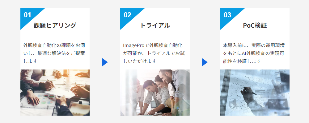 こうした課題を解決するため、当社では以前よりAI外観検査ソリューション「AISIA-AD」(アイシア・エーディ)を提供してきました。AISIA-ADはお客様の検査対象物や運用環境条件に合わせて個別に細かくAIをチューニングし、撮像や搬送の設備も含めてソリューション提供している一方、個別の調査や分析を行うため検証結果が出るまでに通常2~3ヶ月程度を要してしまいます。お客様の中にはAIによる外観検査の可能性を条件付きでも早めに理解して、導入検討を本格的に進めたいという方々がたくさんいます。そのようなケースでは汎化されたAIモデルを簡単な操作で設定導入できるImageProが有効なツールとして、短期検証を経てシステム導入が行えるようになります。