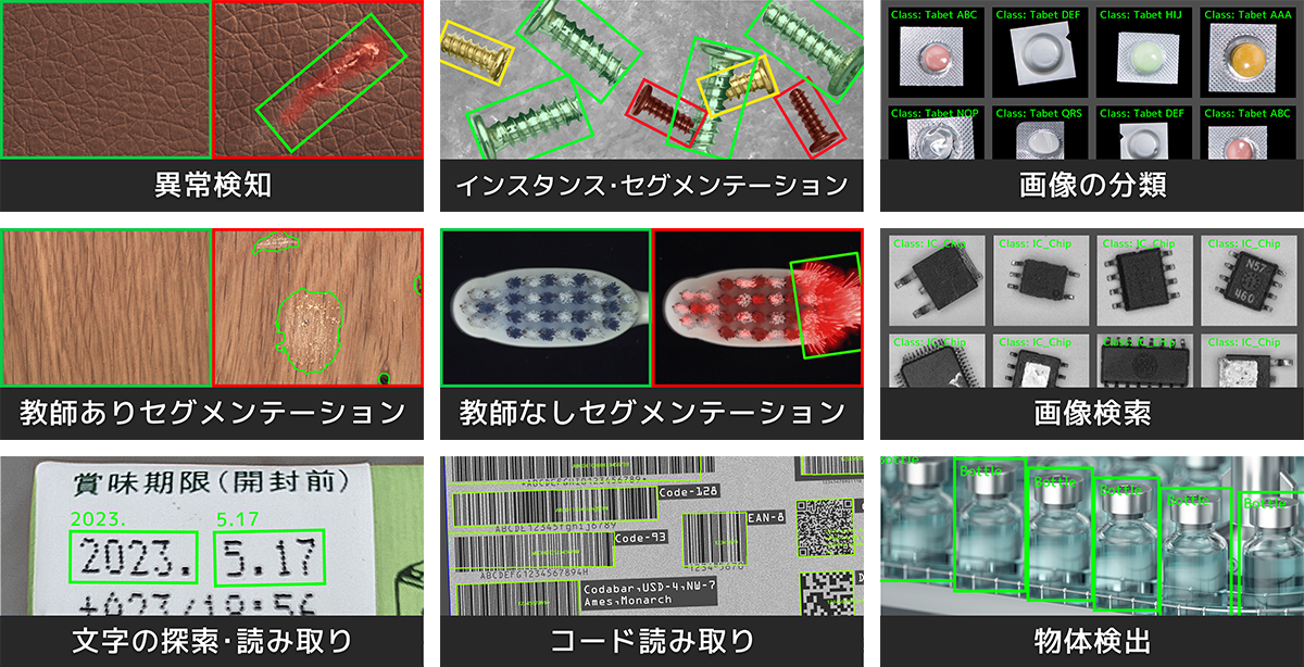 ImageProには、異常検知や教師あり・なしセグメンテーションを利用した外観検査AI機能、物体検出や画像分類など、9種類の代表的なAI手法が標準実装されていますとともに、高速テンプレートマッチングや形状探索、物体追跡などの位置合わせツールや色の計測、画像のゆがみ補正機能など150種類のルールベース機能も用意されています。複雑な異常パターンでは、AI同士やAIとルールベースなど複数の手法や機能を組み合わせることにより高精度な検証結果を実現します。