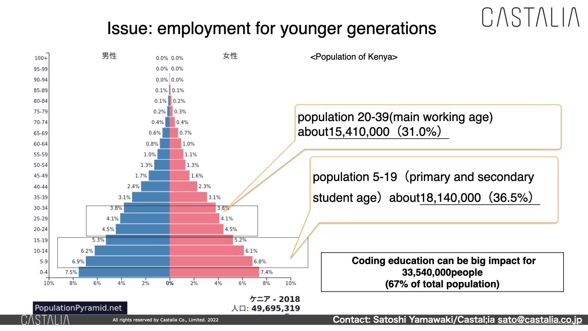 5才から19才までの教育が必要な世代と20才から39才までの研修訓練が必要な世代が全人口の67%を占めます。若年層の雇用創出が間違いなく課題となる中、我々はケニアにおいてコーディング教育と研修を実行します。