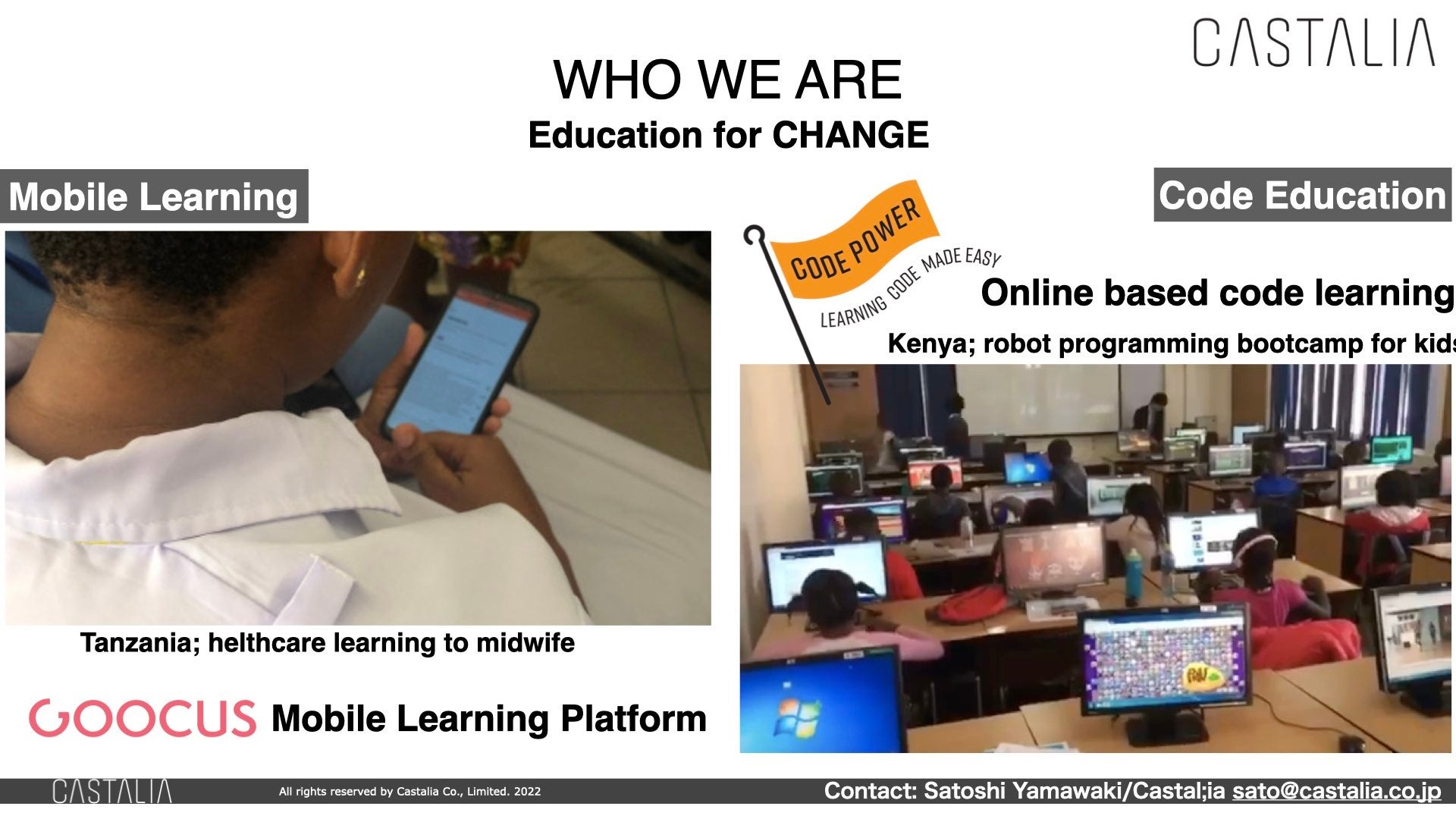 1つ目はモバイルラーニング。キャスタリアは誰でも簡単に教育アプリを作ることができるプラットフォームを持っています。この写真はタンザニア助産師向けの衛生教育を行った時のものです、