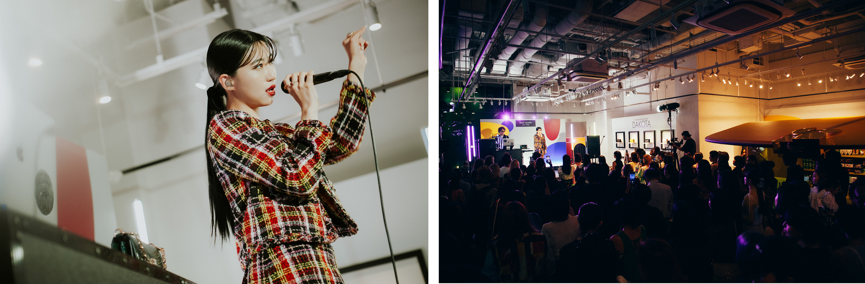 さらに、力強さと甘さ、切なさが共存する歌声で人々を魅了するシンガーソングライターeillさんがスペシャルライブを実施。「Kate Spade Dakota Event in Tokyo」プレオープニングパーティーのためにセットされた全4曲を披露し、会場を盛り上げました。