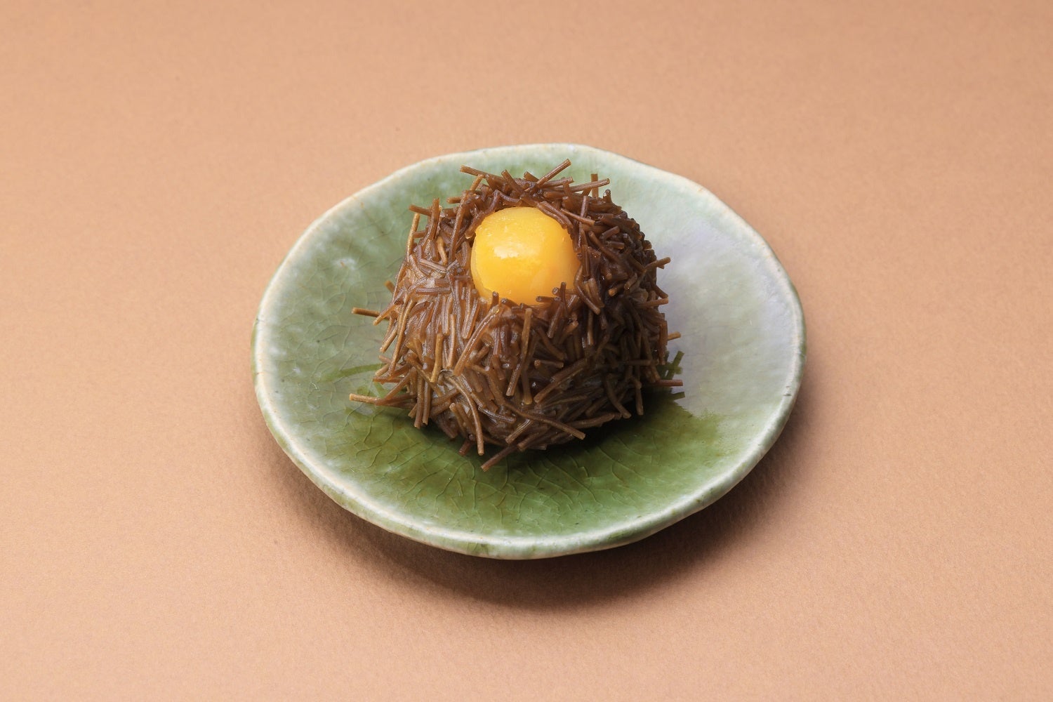 こし餡入りの蒲鉾で栗甘露煮を包み、いがは茶そうめんで表現しました。