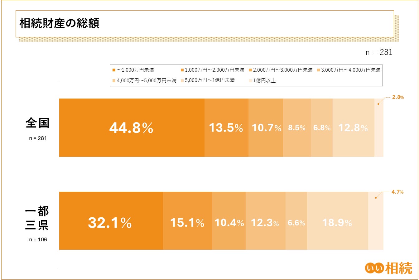 一都三県においても、前回4位だった「5,000万円〜1億円未満」が今回2位に浮上しており、全国と比較しても相対的に高額な相続財産の割合が多い傾向が見て取れます。