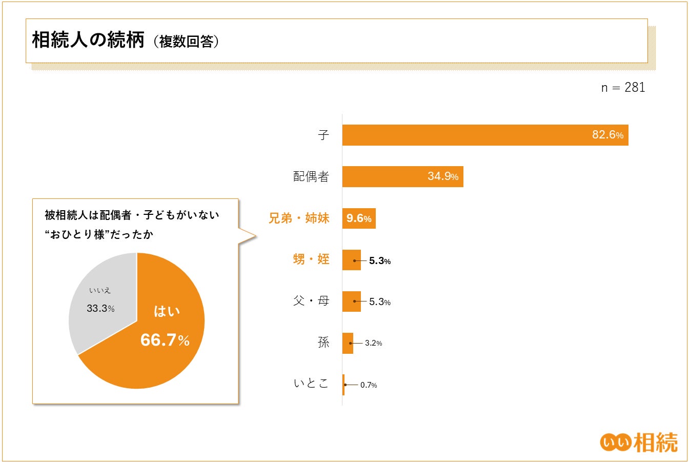 また、相続人が「姪・甥」「兄弟・姉妹」と回答した方に対し、「被相続人は配偶者・子どもがいない“おひとり様”(*1)だったか」を尋ねたところ、「はい」と回答した人は66.7%になりました。