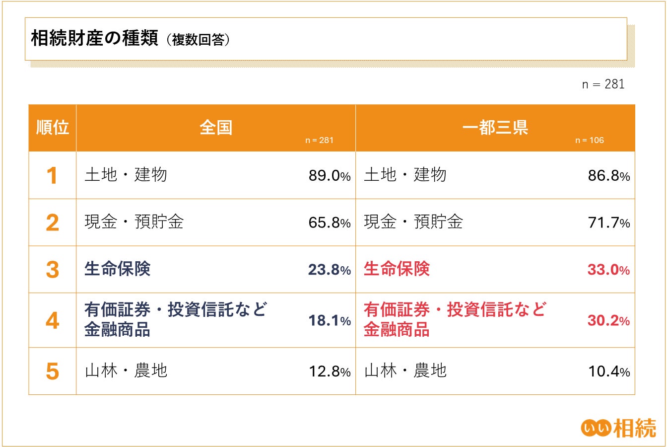 また、一都三県と全国の相続財産の内容を比較すると、全体的な順位に変化はないものの、「有価証券」および「生命保険」については、両者の間に顕著な割合の差が見られました。この結果から、一都三県では資産管理に対する意識が、全国と比べて相対的に高い傾向がうかがえます。