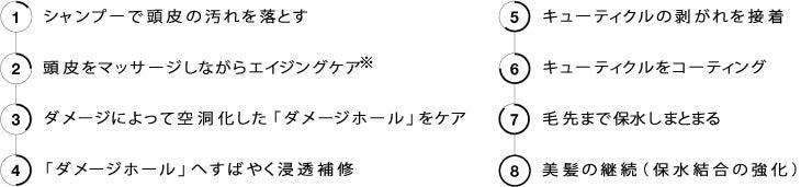 ダメージ補修と潤い補給の両面から“するん髪”へ導く、「エイトザタラソ」のスムースリペアシリーズ。毎日のシャンプー・トリートメントで、8つのステップを繰り返しながら、一時的な補修にとどまらない本質的な美髪の成長を段階的に導きます。