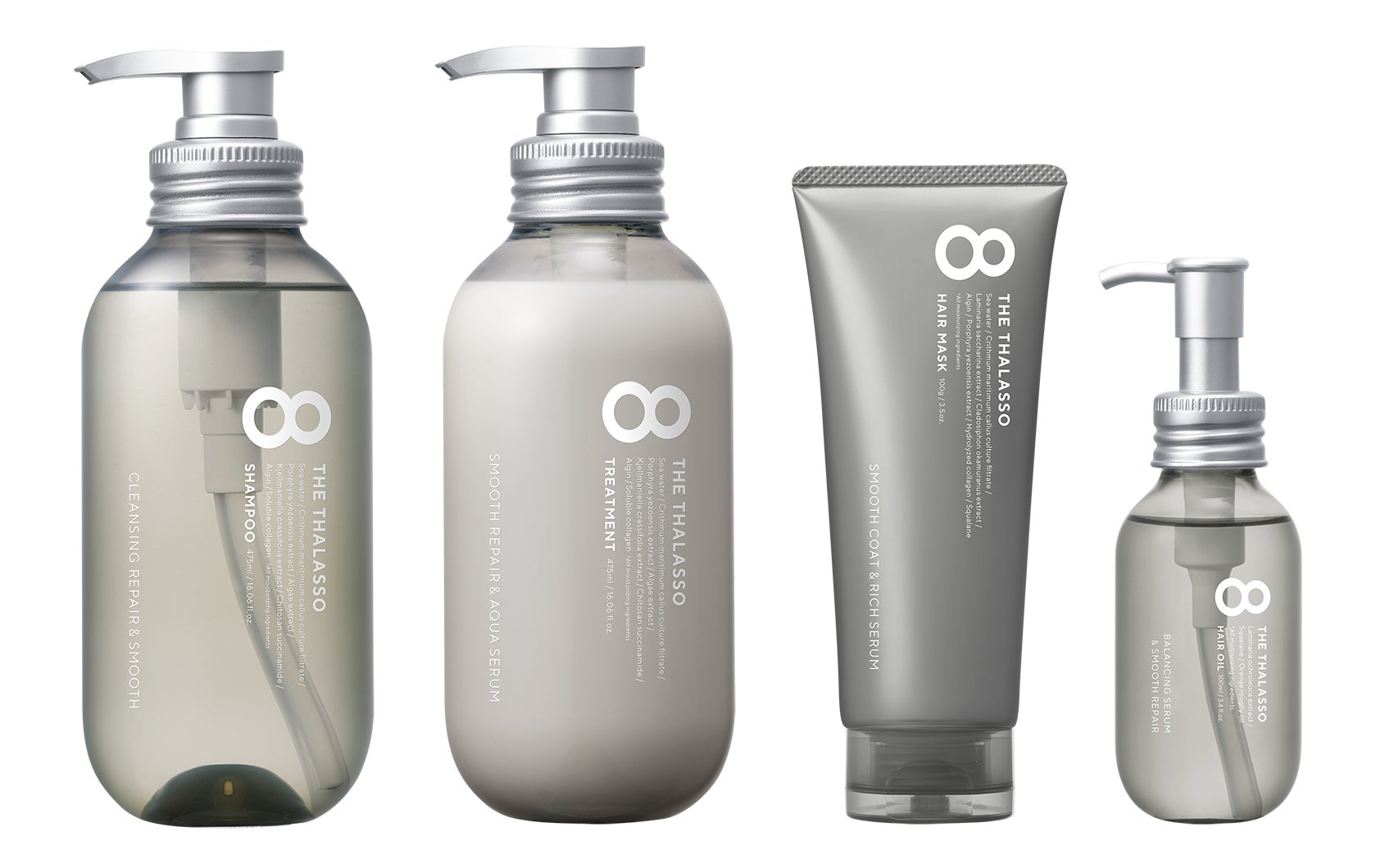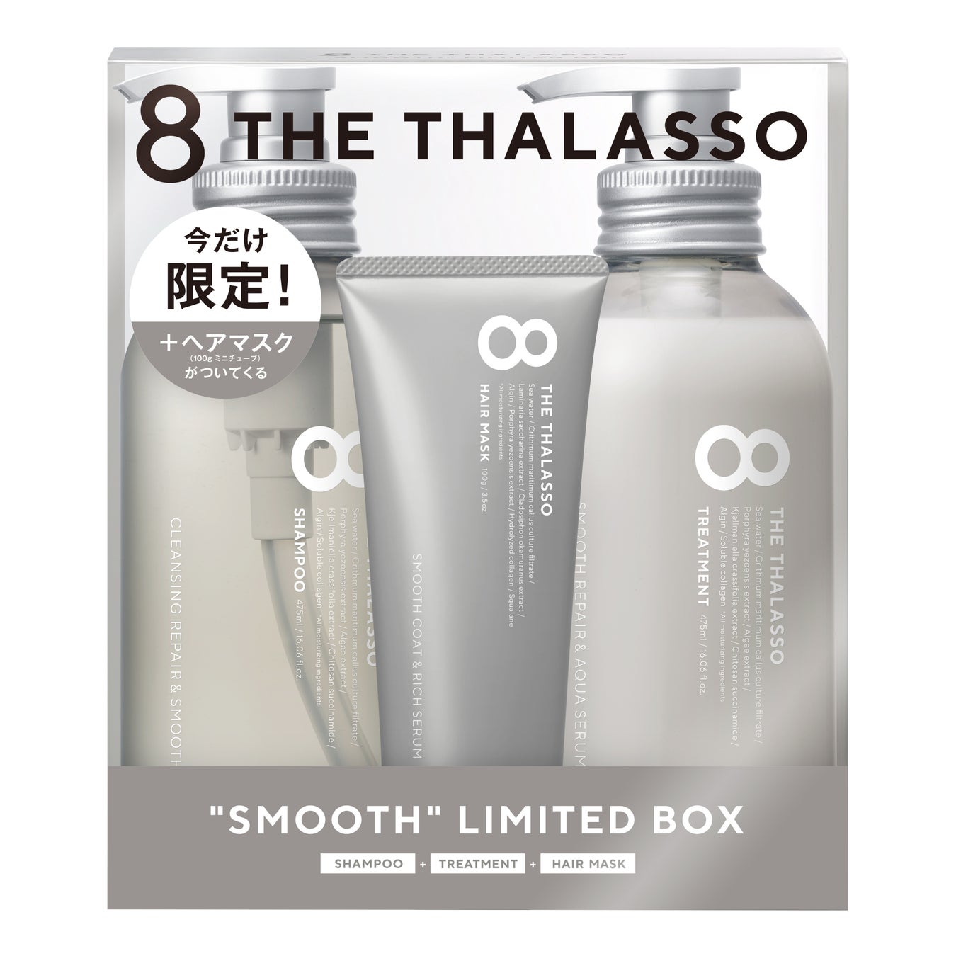 また、新シリーズ発売にあたり、「エイトザタラソ スムースシャンプー&スムーストリートメント ミニヘアマスク付き 限定キット」(¥2,800[税抜])も同時発売。シャンプー、トリートメントに、お試し用の100gミニサイズのヘアマスクがセットになっています。