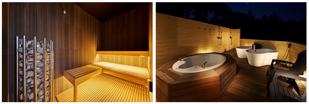 施設内で楽しめる温泉やマイグレ自慢のサウナルームも完備しています。マイグレお馴染みの本格的なフィンランド製サウナヒーターHarviaを採用しているほか、二段式のベンチ構造となっているので、サウナ初心者から上級者の方まで、自分に合った温度で楽しむことができます。サウナの後はオーバーヘッドシャワーで汗を流すも良し、大型ジャグジーや露天風呂でリフレッシュも良し。なお、製氷機を準備していますので、冷水浴も思う存分楽しめます。最後は、小あがりでゆっくりおくつろぎいただくことができます。