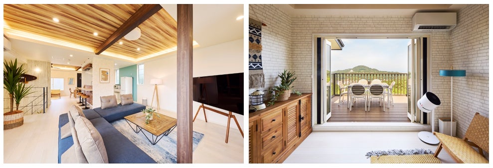 「マイグレケニーズハウス」は、最大16名が宿泊可能で、まるでリゾート地に建つタワーマンションの最上階にいるかのような贅沢な気分が味わえる大型の一棟貸別荘です。共用空間では、デッキやテラス、サウナエリアも含めると、1階・2階合わせて136㎡(82畳)、テラスにつながる大きな窓を開けると、明るい自然光に心地よい風も吹き抜け、開放感あふれる空間を楽しむことができます。展望リビングやデッキから、緑に包まれた山々と広がる青空、相模湾や初島の美しい景色、夜には豊かな自然が紡ぎだす音色と夜風を感じながら街の灯りを一望できるなど、訪れる宿泊者の方々に非日常な時間を提供します。