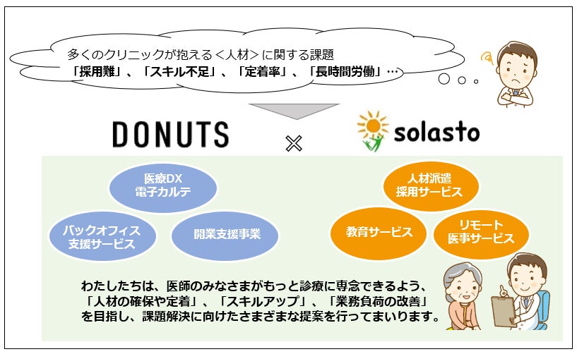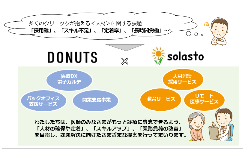 このたびのパートナー契約により、ソラストは「医療事務と医事人材」にかかわるノウハウをDONUTSのサービスメニューとして提供していきます。