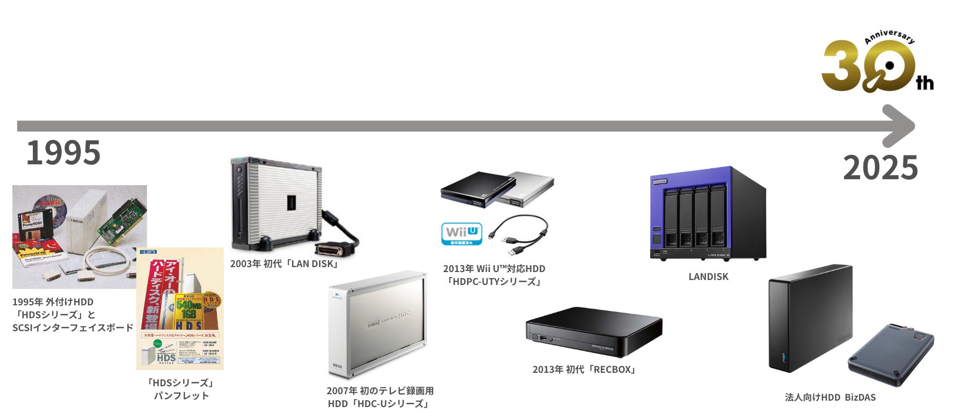 アイ・オー・データは、1995年5月16日に外付けHDD「HDSシリーズ」をリリース以来、30年にわたり、家庭用から法人向けに至るまで、幅広い製品を提供してまいりました。