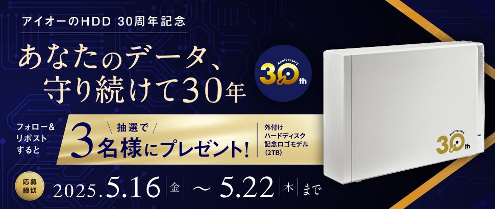 株式会社アイ・オー・データ機器(本社:石川県金沢市、代表取締役会長:細野 昭雄、以下、アイ・オー・データ)は、本日2025年5月16日にハードディスク(HDD)事業が30周年を迎えることをお知らせいたします。1995年の「HDSシリーズ」発売開始以来、皆さまのご愛顧に支えられ、ハードディスク累計出荷台数は3,000万台(※)を超え、今もなお愛され続けています。ユーザーの皆様への感謝の気持ちを込めて、Xにて30周年を記念したプレゼントキャンペーンを実施いたします。