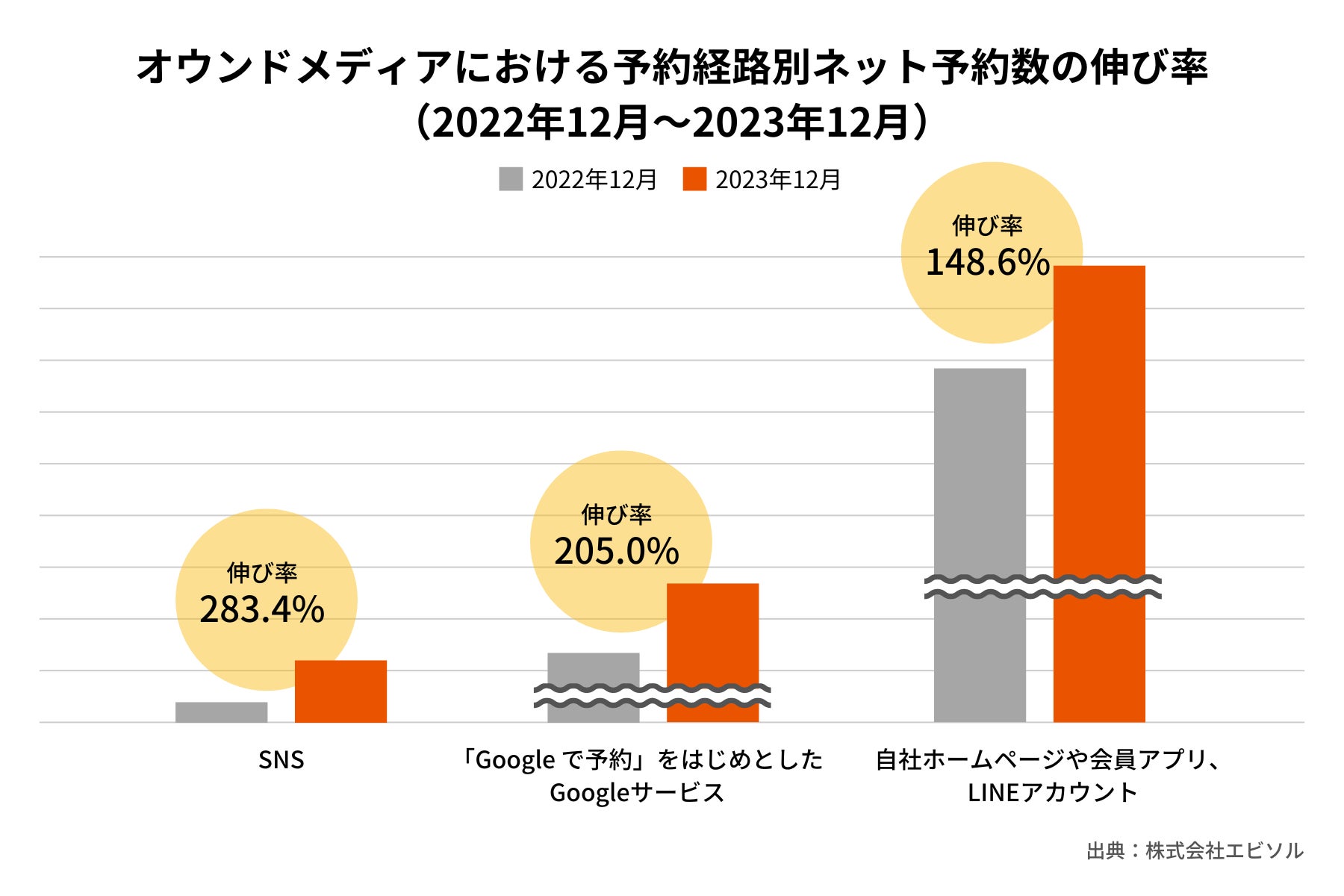 また、オウンドメディアの種類別に伸び率を見ると、自社ホームページや会員アプリ、LINE公式アカウントが148.6%に伸長。さらに、InstagramなどのSNSが283.4%、「Google で予約」などのGoogleサービスが205.0%にのぼるなど、全体の伸長に加えて飲食店予約におけるInstagramやGoogleなどの利用率が増加傾向にあることがうかがえます。
