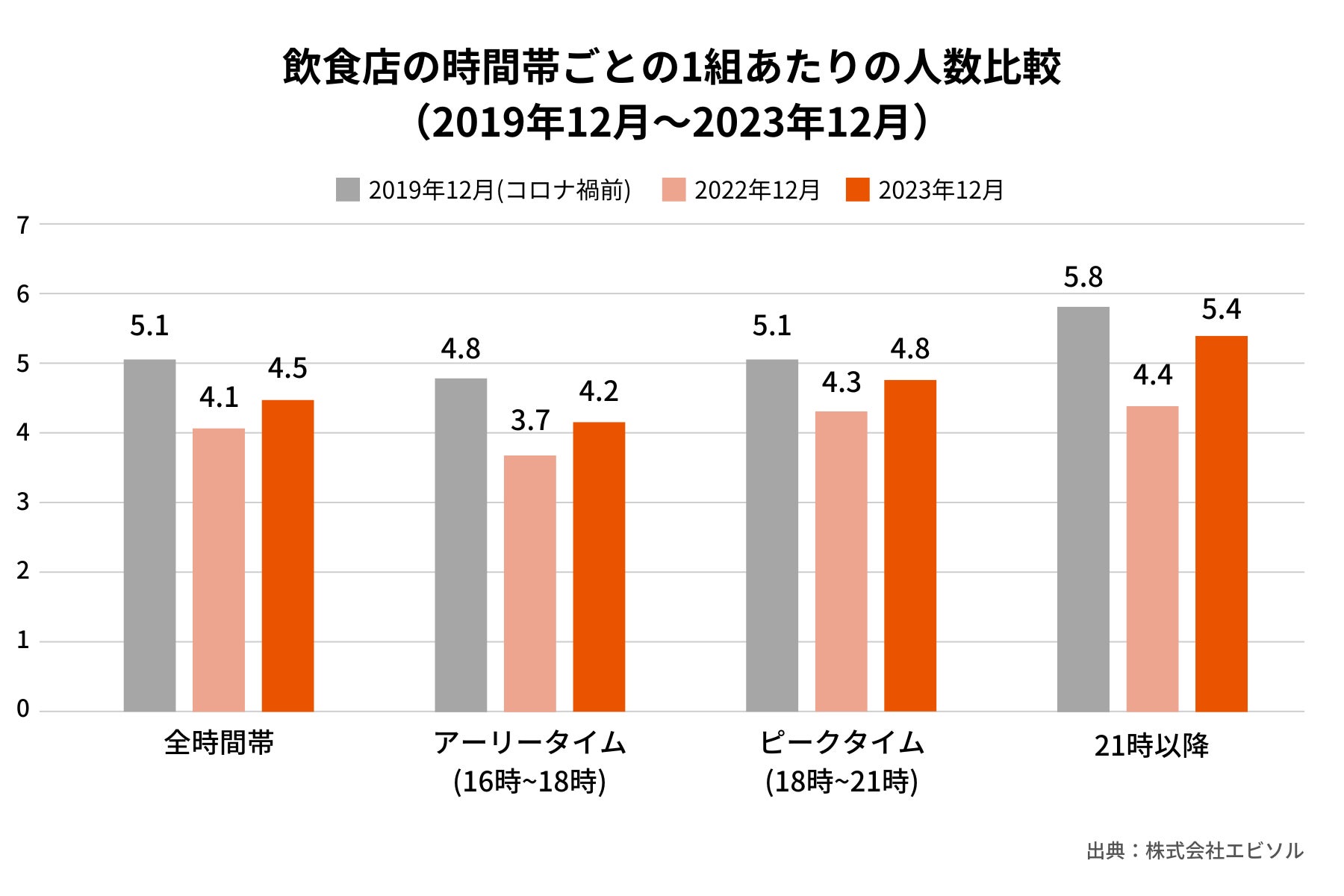 4. 1組あたりの人数では、2019年には依然満たないものの、前年比では全時間帯で平均人数が拡大傾向に