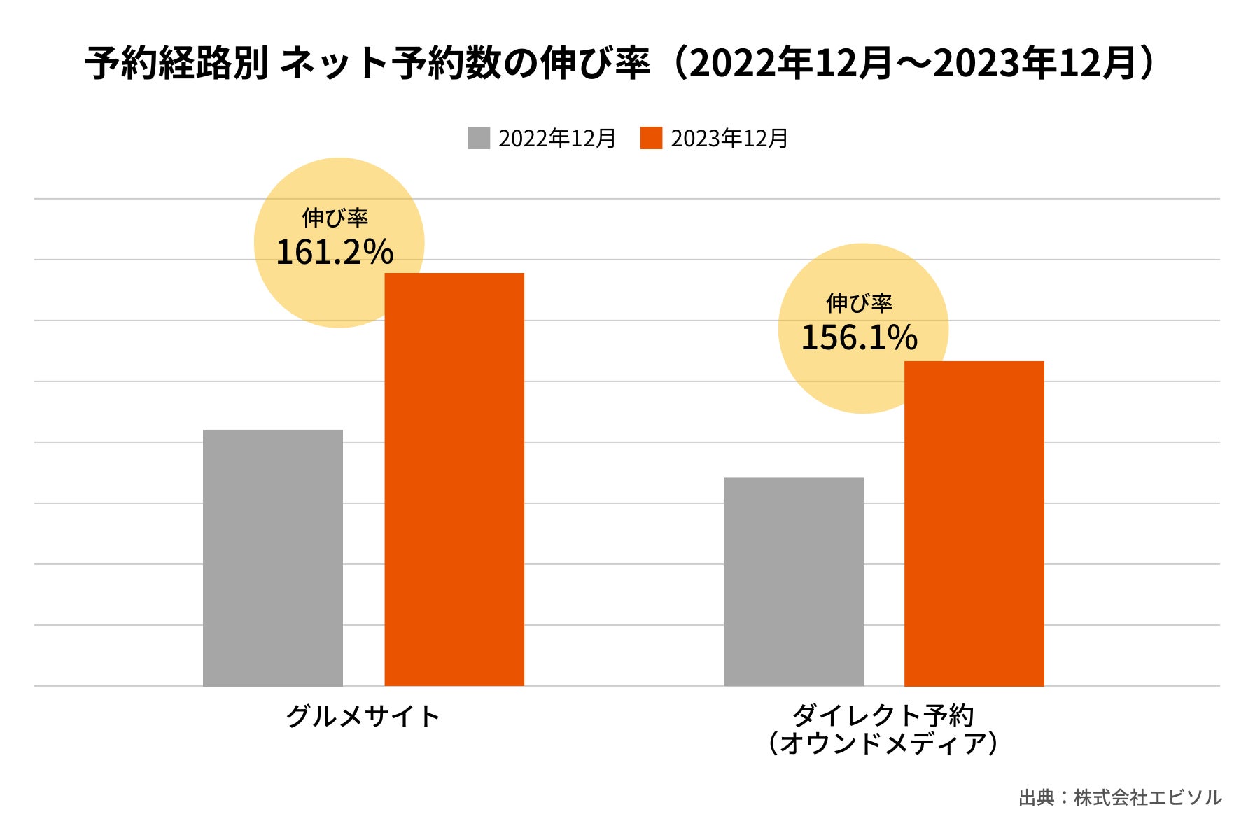 また、予約手段別の伸び率を見ると、ネット予約が158.9%と電話予約を超える伸び率で増加しました。電話予約も140.8%と、2023年は飲食店への予約数全体が大きく回復し、飲食店にとっては営業中の予約電話の対応にリソースを取られるなど、急速な需要増加に対する体制構築や経営効率化が一つのテーマとなりました。