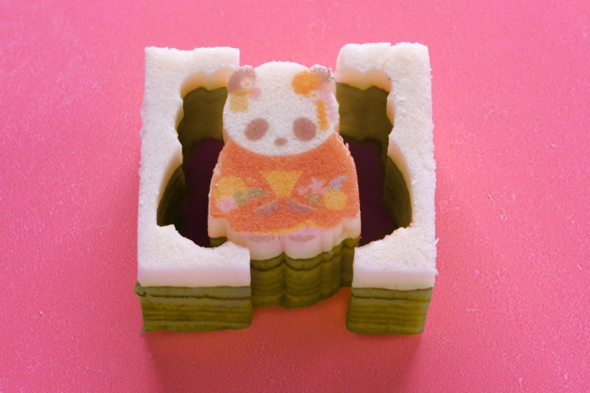 桃太郎になりきった、かわいいパンダの型ぬきバウムができました。きびだんごをお腰につけて、鬼退治にいくところ。桃の果汁がすっきりと爽やかに香る、まろやかな甘さのもも味です。