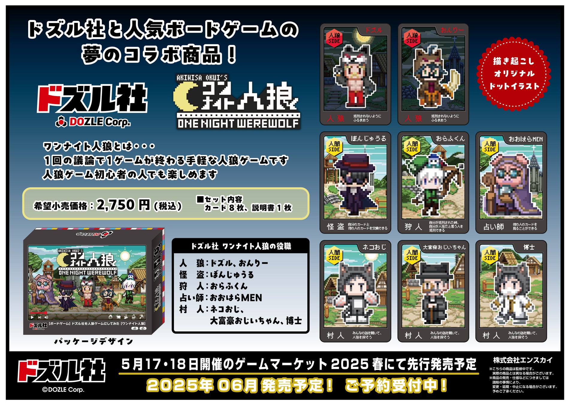 株式会社エンスカイから、ゲーム実況グループ『ドズル社』と人気ボードゲーム『ワンナイト人狼』のコラボ商品を発表。