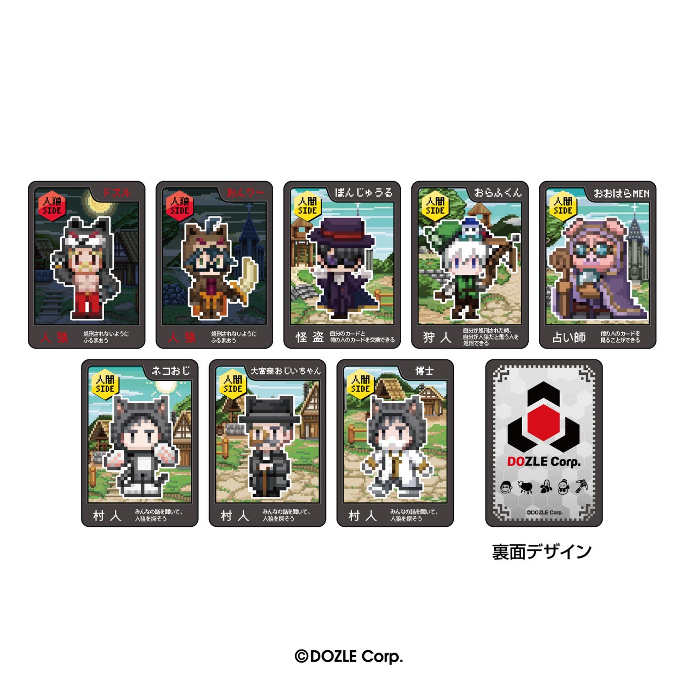 ドズル社メンバーのドズル、ぼんじゅうる、おんりー、おらふくん、おおはらMENと、プロデューサー/ナレーターのネコおじがワンナイト人狼の役職の衣装を着た、オリジナル描き起こしドットイラストを使用しました。