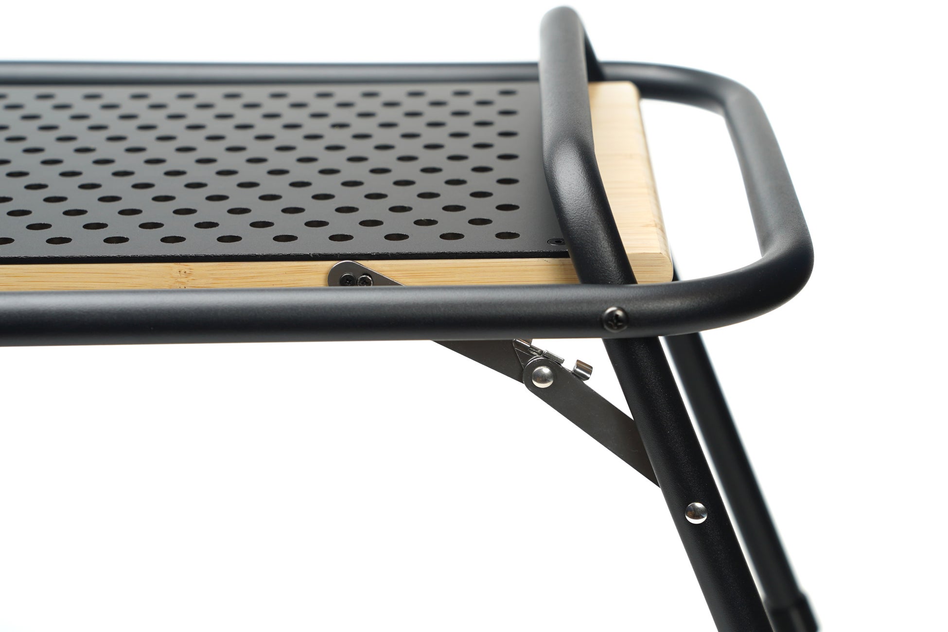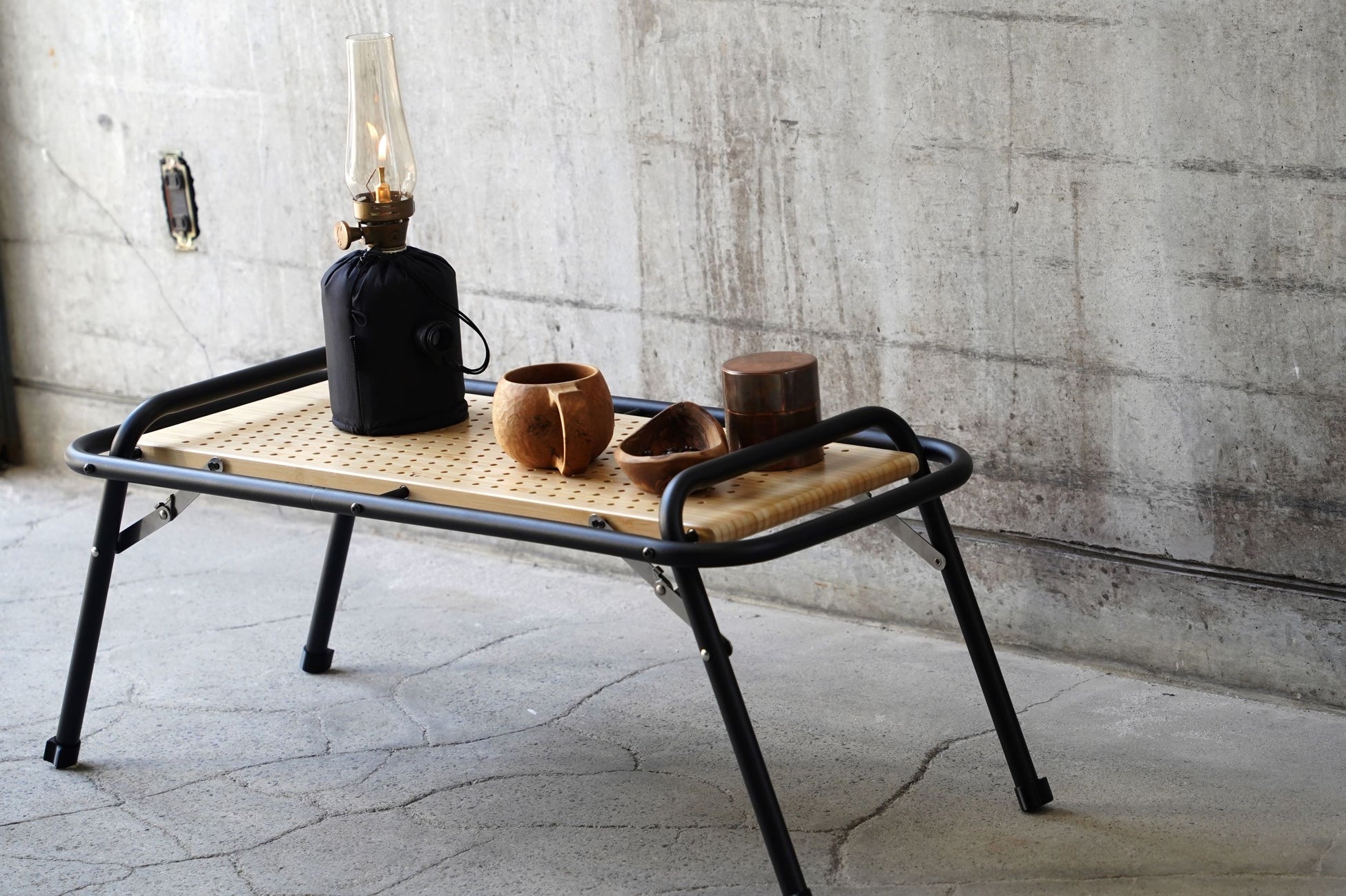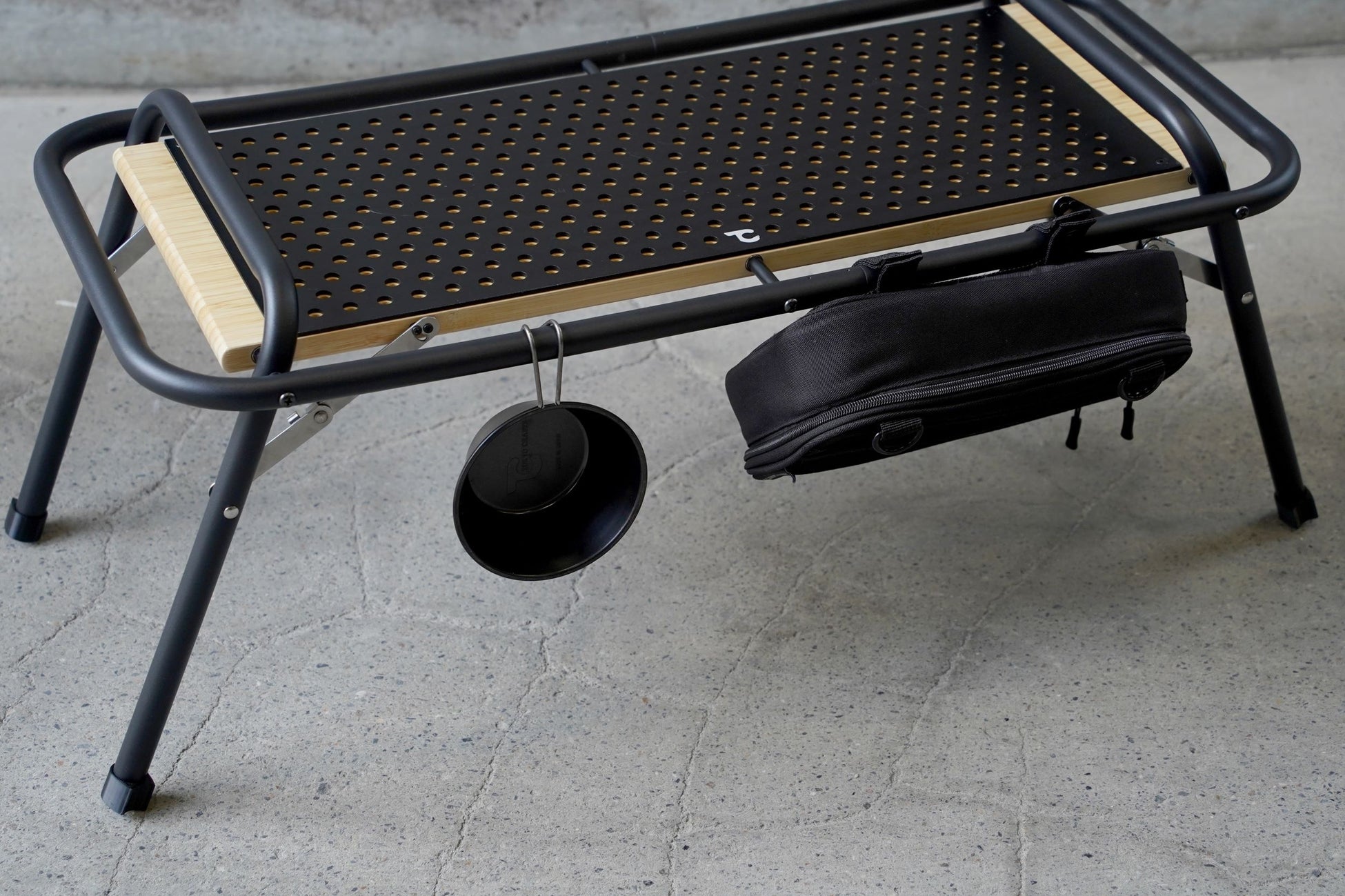 天板には、耐熱性のある軽量アルミ素材と、自然素材で環境にやさしいバンブー素材を採用しています。無骨なスタイルのアルミ天板は、バーナー調理などアウトドアでのアクティブなシーンに最適です。バンブー素材の天板は自然の中でのリラックスタイムや、キャンプサイトでのお食事を華やかに彩ります。天板周囲にパイプが配置され、シェラカップなどを引っ掛けることも可能です。