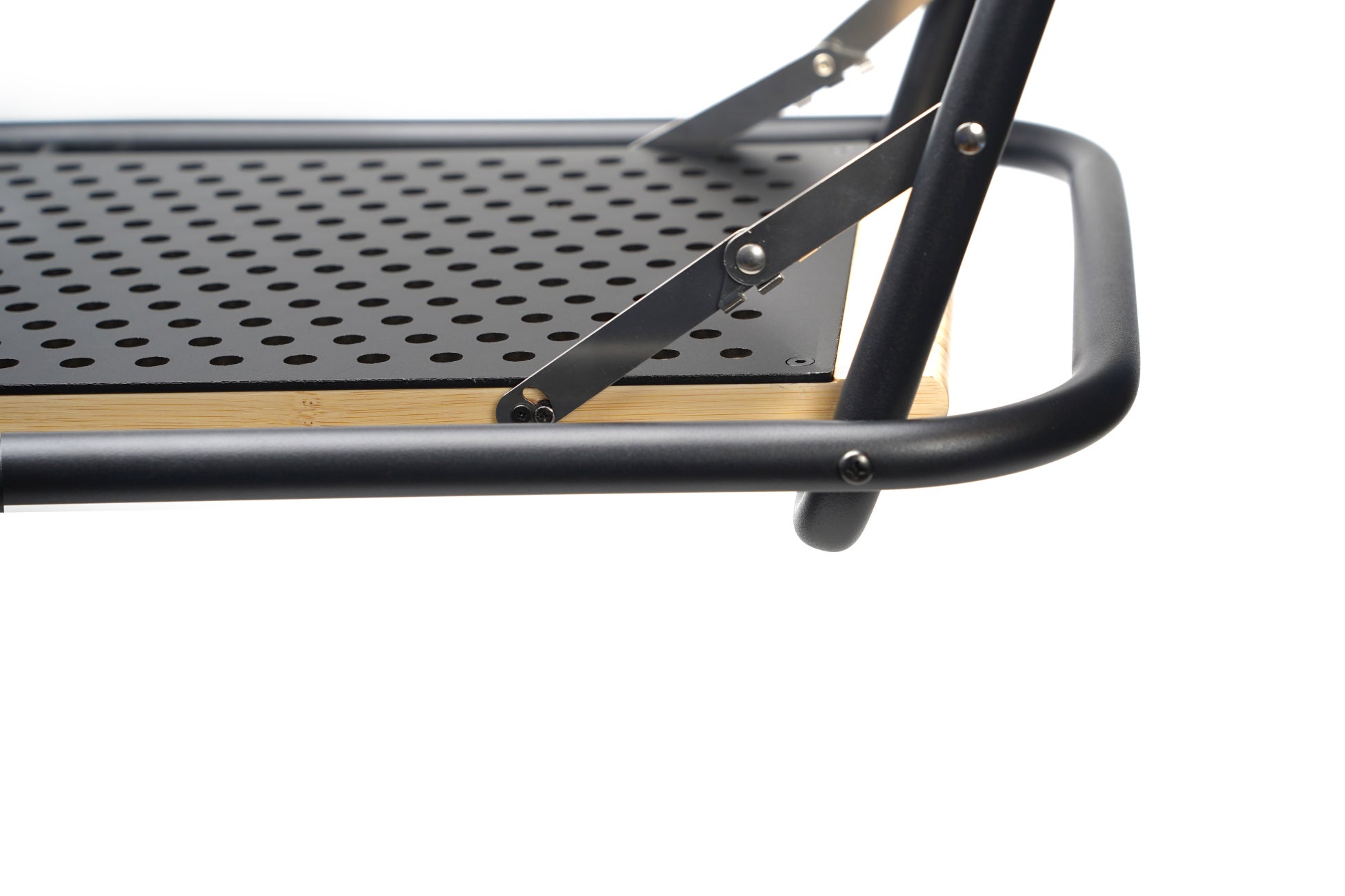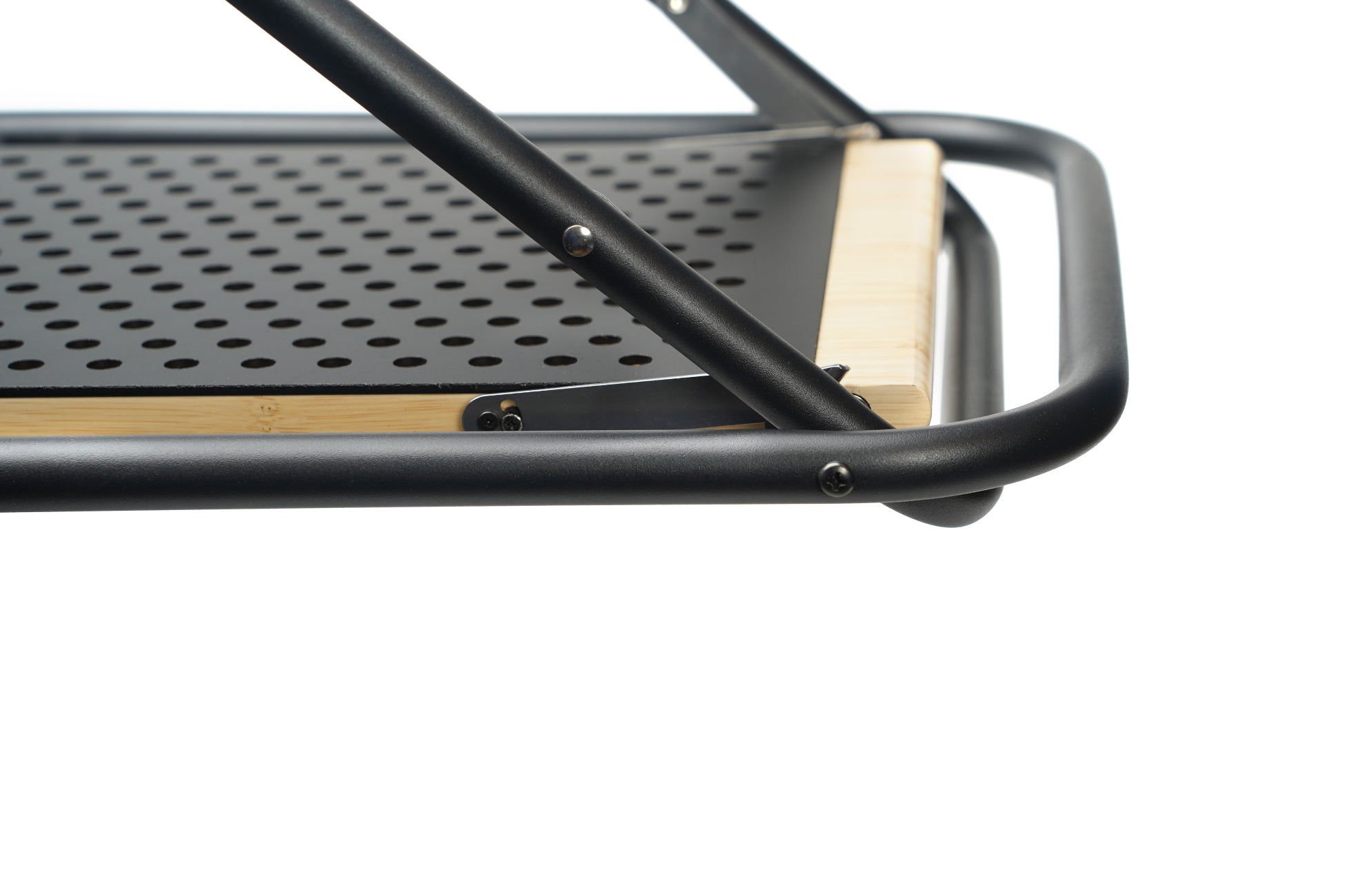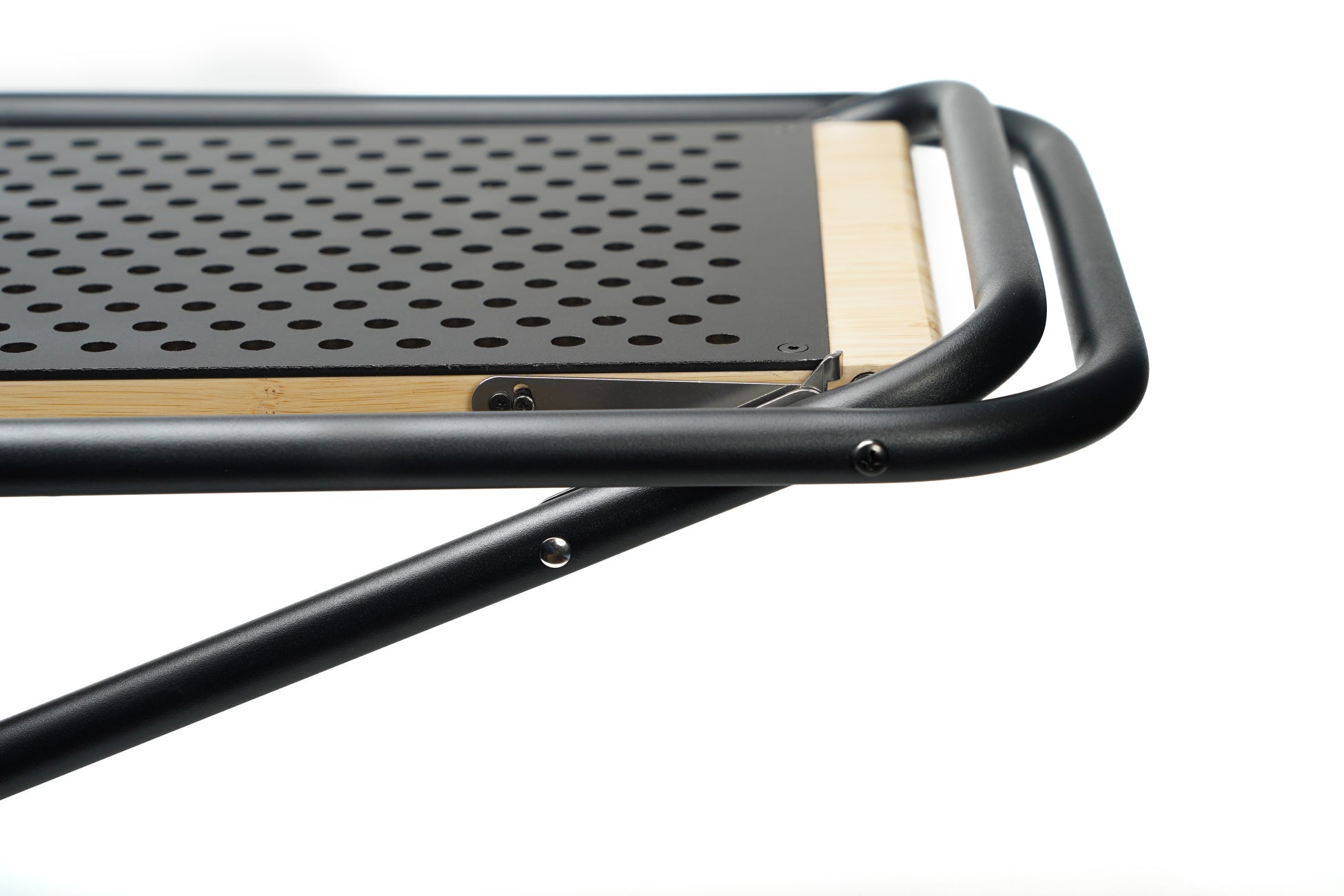 天板には、耐熱性のある軽量アルミ素材と、自然素材で環境にやさしいバンブー素材を採用しています。無骨なスタイルのアルミ天板は、バーナー調理などアウトドアでのアクティブなシーンに最適です。バンブー素材の天板は自然の中でのリラックスタイムや、キャンプサイトでのお食事を華やかに彩ります。天板周囲にパイプが配置され、シェラカップなどを引っ掛けることも可能です。