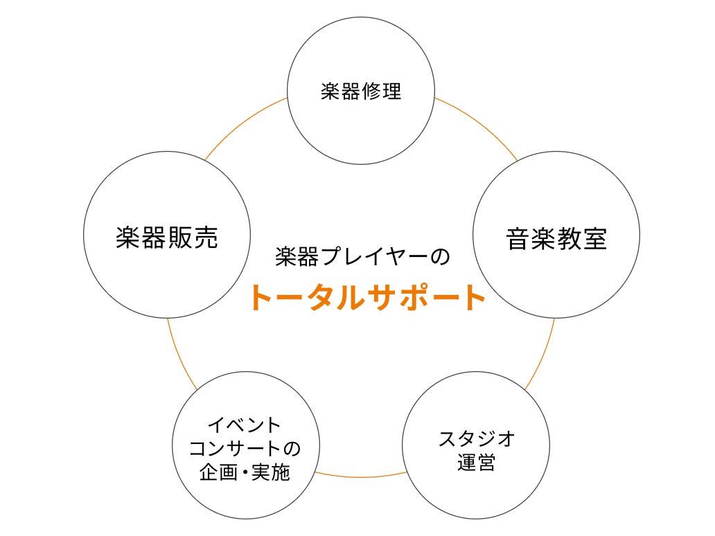 事業領域として「楽器プレイヤーのトータルサポート」を掲げ、楽器販売と音楽教室の2事業を主軸としながら、長く演奏していると必要になる楽器修理、体験や演奏発表の場としてのイベント・コンサートの企画・実施、気兼ねなく練習できるスタジオ運営も行っています。