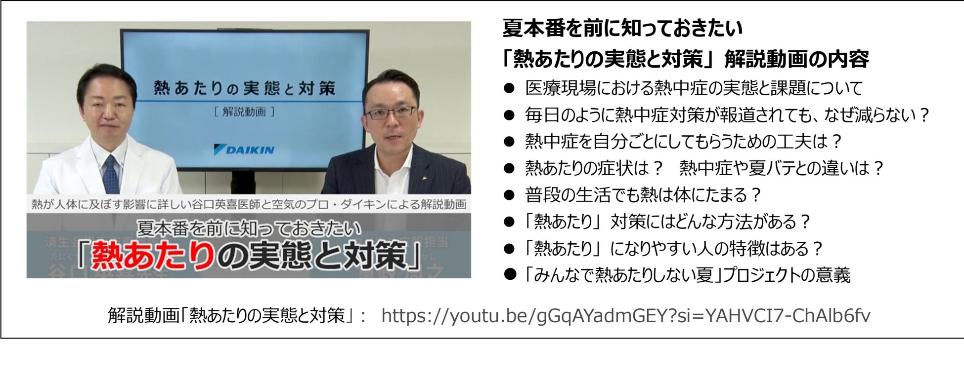 ダイキン工業株式会社は、暑い時期の「熱」による身体的な不調全般を指す「熱あたり」に対する理解促進と対策意識の醸成を目的に、解説動画「熱あたりの実態と対策」を作成し、2025年7月11日にダイキンのWEBコンテンツ「みんなで熱あたりしない夏」とYouTubeダイキン公式チャンネルにて公開しました。