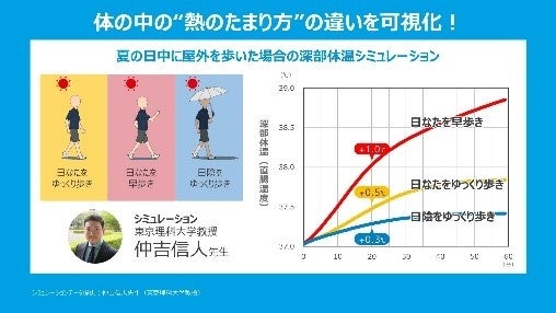 ダイキン・重政:普段の生活でも体に熱はたまります。東京理科大学の仲吉教授が開発した、外部環境の情報と生体情報を融合した「人体熱収支モデル」のシミュレーションによると、日なたを早歩きした場合、日陰をゆっくり歩いた場合と比べて深部体温が0.7℃高くなることが分かっています(周囲の環境や歩く速さよって、体への熱のたまり方が変わる)。