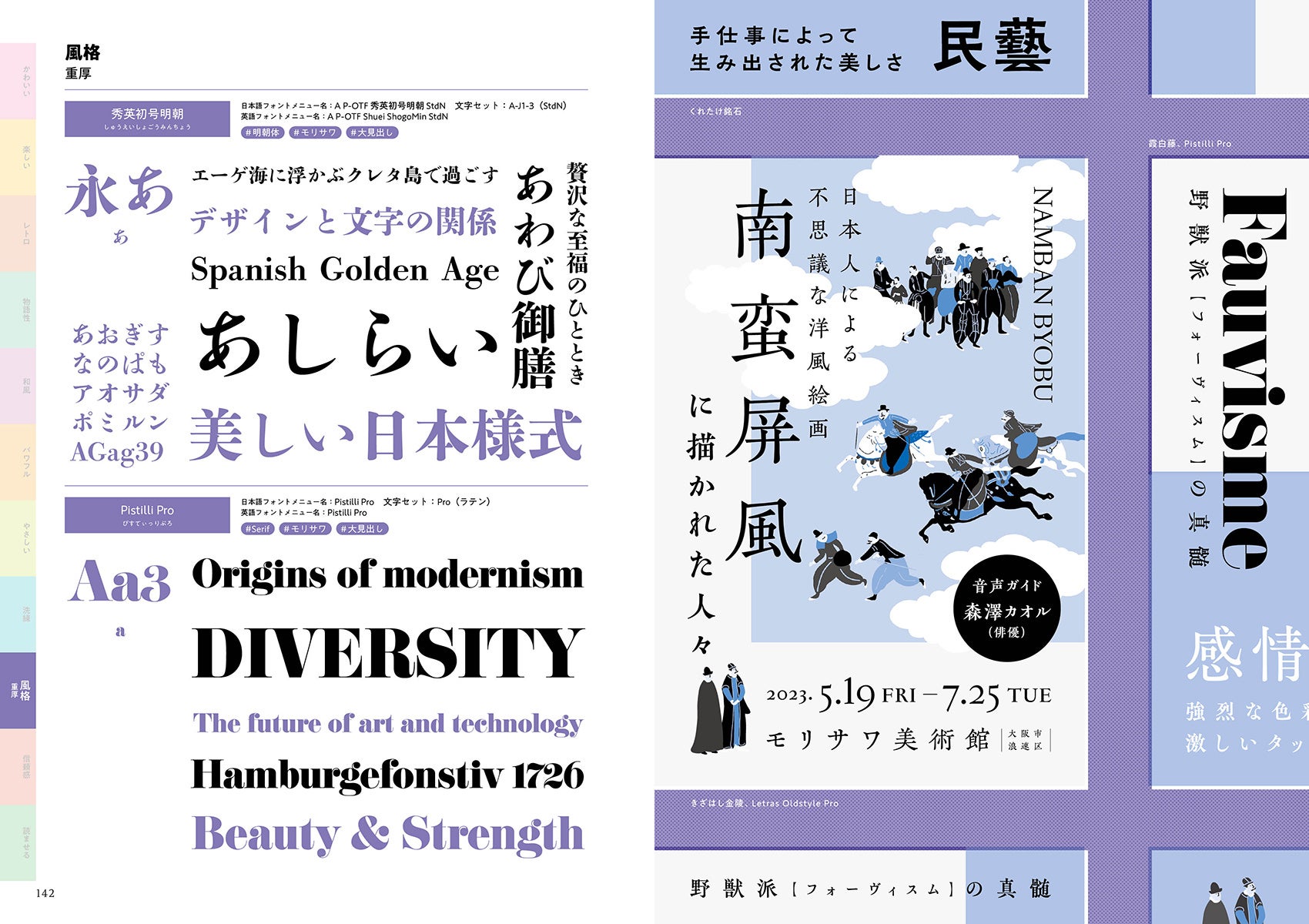 本書では、モリサワの書体一覧を「表現・特徴・全書体見本」という3つのカテゴリから探すことができます。これにより制作物に最適な書体を、3,500種類以上のMorisawa Fontsライブラリから直感的に選択することが可能です。