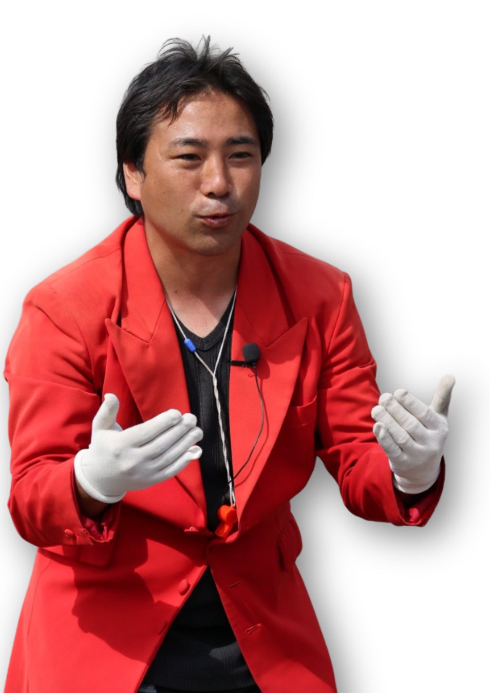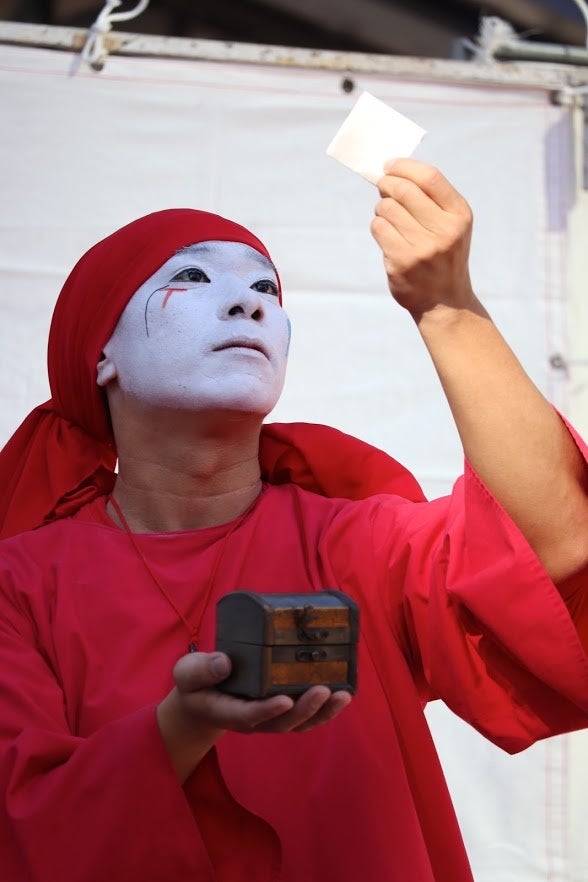 赤い衣装が駆け巡る「パントマイム演芸師」。