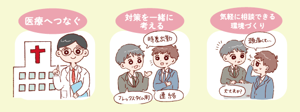 社会人に起こりがちな職場のメンタルヘルス対策の一環として、医療につなぐ、一緒に解決策を考える、気軽に相談できる環境を整えるなど、働く人と職場が協力して不調を乗り越えていけるのが理想的です。
