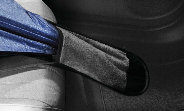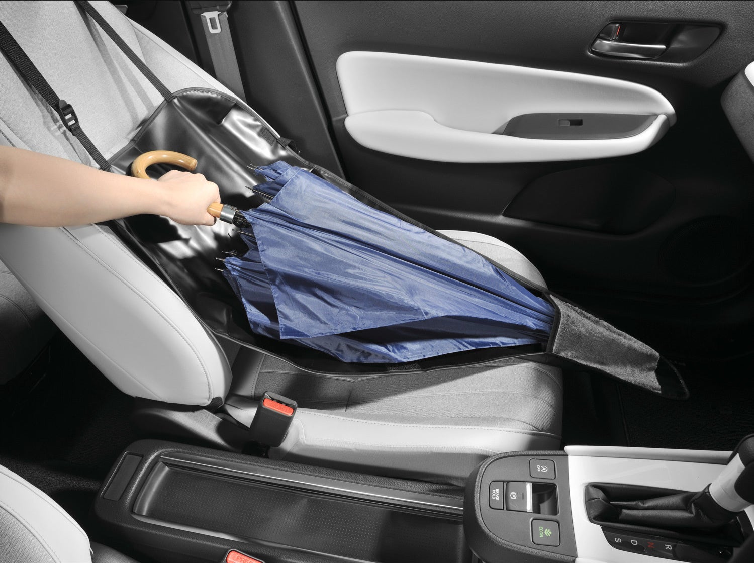 濡れた傘をそのまま助手席に収納できる傘入れです。広げた状態と同様のサイズ・形状にしたことで、きちんとたたむことなく傘入れに収納できます。大きな作りで座席が濡れることを防ぐため、車内での傘の扱いが楽になります。