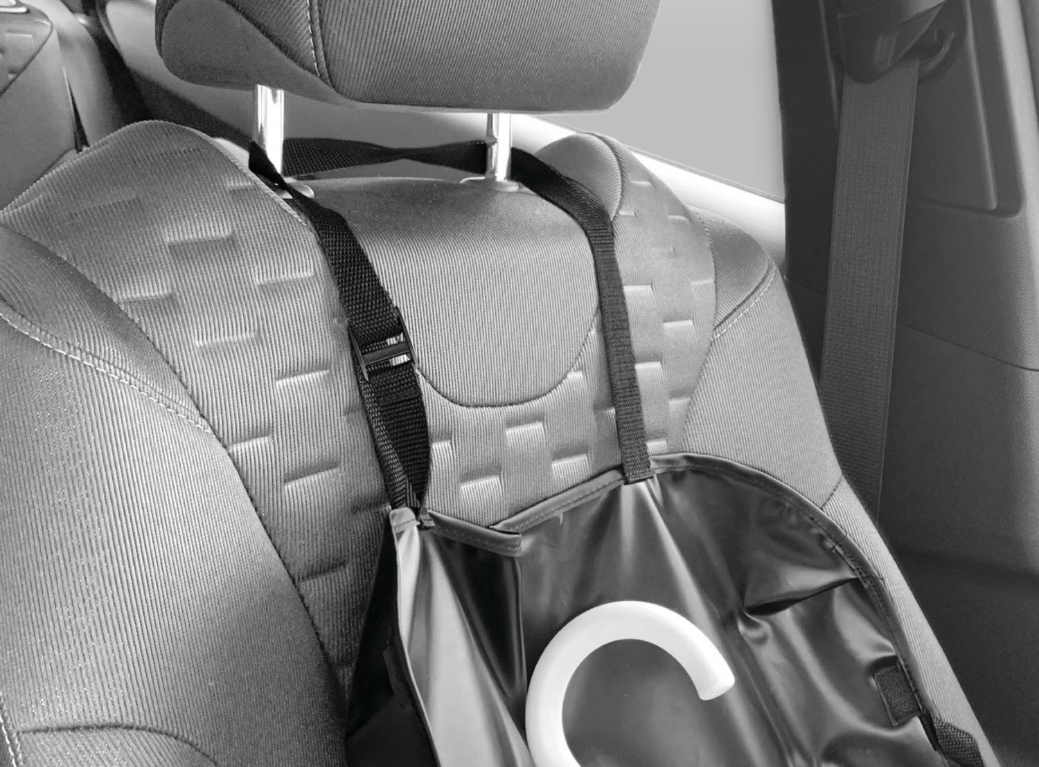 二つに折れば袋状になり、フックをヘッドレストに掛けることで後席に設置することができます。(写真右)