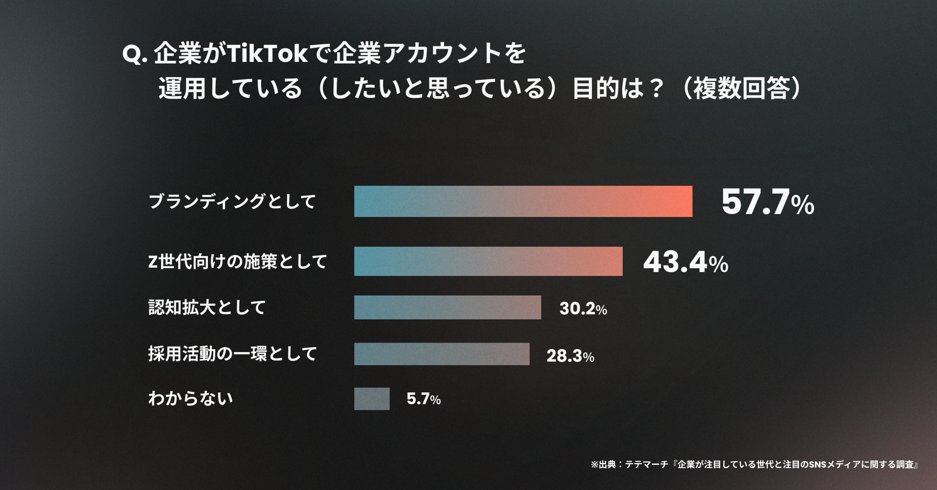 【仕事をするうえで注目しているSNSメディアは?】という質問の回答はInstagram、Twitterに続き『TikTok』は15.3%の3位でしたが、【Z世代と相性が良いと思うSNSは?】の回答は『TikTok』が40.3%と1位。さらに【企業がTikTokで企業アカウントを運用している目的は?】については“Z世代向けの施策”という回答が43.4%と高く、企業もZ世代=『TikTok』となっているイメージの結果が出ました。