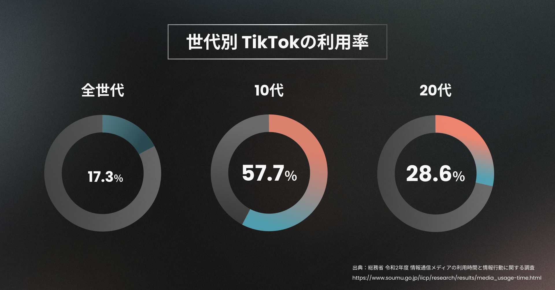 『TikTok』は2016年に運用を開始し、2021年には世界10億人以上が利用した(※1)SNSアプリです。総務省が2021年8月に発表した「令和2年度 情報通信メディアの利用時間と情報行動に関する調査」(※2)によると『TikTok』の全世代の利用率は17.3%ですが、10代の利用率は57.7%、20代の利用率は28.6%と若者層が圧倒的に利用しているデータ結果が出ています。
