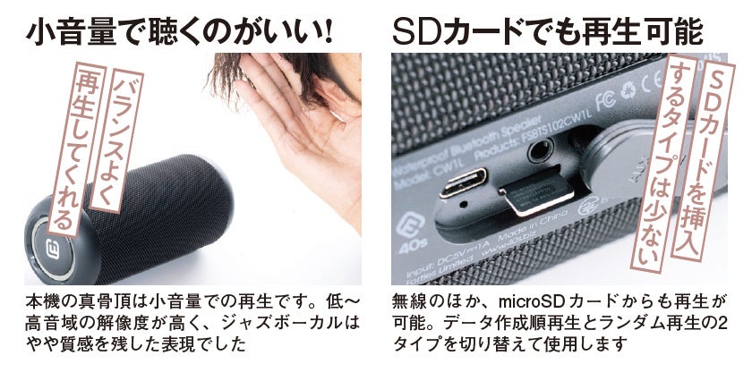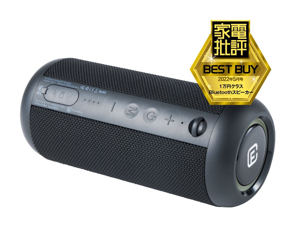 正面に7.5Wのドライバーが2つ、両サイドにパッシブラジエーターを搭載した筒状のBluetoothスピーカー。形状は一般的なスピーカーですが、やや大きめです。小型スピーカーは低音があまり出ないものですが、本製品はその特性を生かした高音域のハッキリした粒立ちのいい音で、さらにパッシブラジエーターがいい仕事をしており、懸念されていた低音の量感も十分出ていて、バランスが優れています。どんな楽曲にもフィットしてくれ、小音量の再生においてもそのバランスは崩れません。