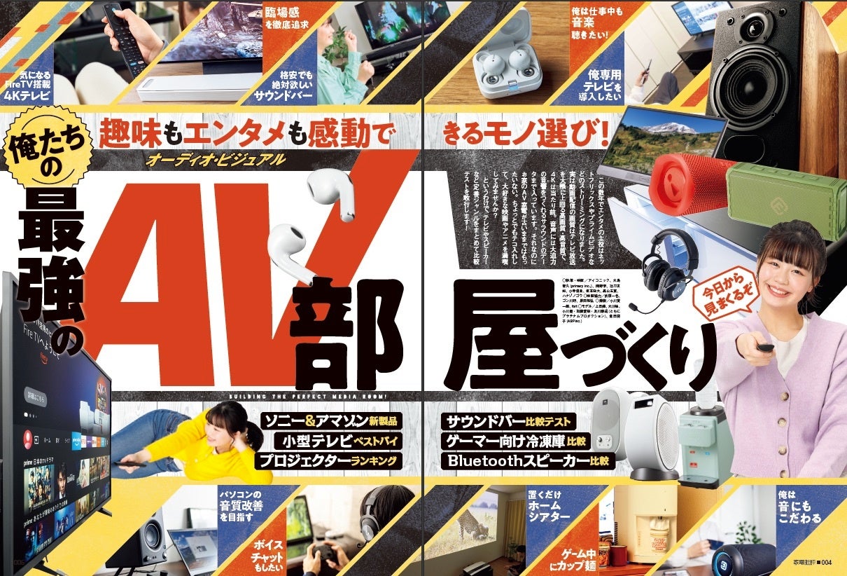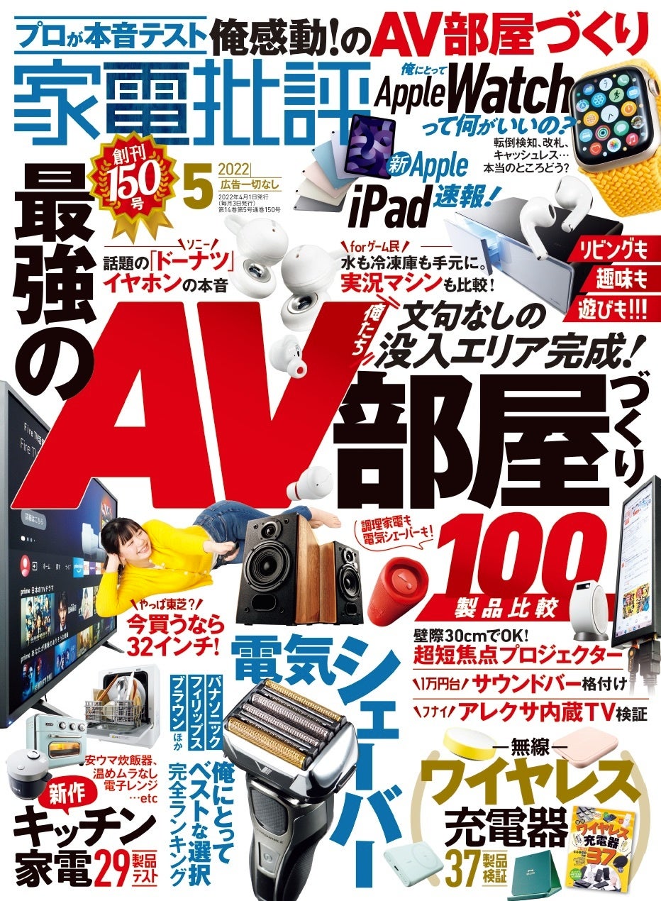 5月号の家電批評は創刊150号! 小型液晶テレビやBluetoothスピーカー、モバイルプロジェクターから映画向けサウンドバーまで徹底比較を行い、最強の部屋づくりをかなえるAVアイテムを大発表しています。そのほかにも、新生活スタートのタイミングでそろえたい「キッチン家電29製品◯✖️品評会」や、人それぞれに違うヒゲのお悩みを解決する「電気シェーバー自分ベスト決定戦」、手軽にスマホの充電ができる「ワイヤレス充電器37製品格付け」など、暮らしを快適に変える家電情報満載でお届けしています。 本リリースでは、商品テストに基づく編集部おすすめのベストバイ製品の一部をご紹介します。