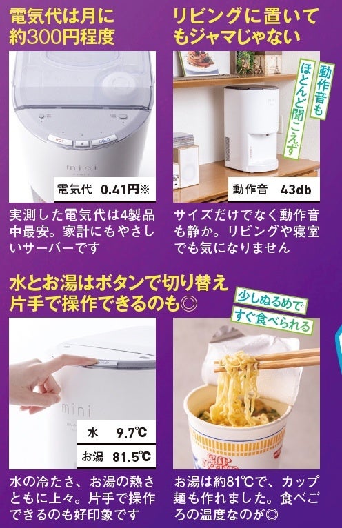 ベストバイとなった決め手は、冷水の実測値が10℃以下と冷たく、お湯が80℃以上と熱かった点と、サーバーのレンタル料がかかるものの、浄水式のため水をたくさん使う人ほどランニングコストが下がる点です。お湯の温度はカップ麺の麺に芯が残らず、ちょうど食べごろの温度なのもポイント。しかも、カートリッジの効果で水道水のイヤな匂いが消えて、おいしく飲めたのはおどろきです。給水タンクは3.3Lもあるので、給水はある程度の回数でOK。交換式と違い、補充する水の在庫も気にしなくて良いので、存分にゲームや映画に没頭できます。