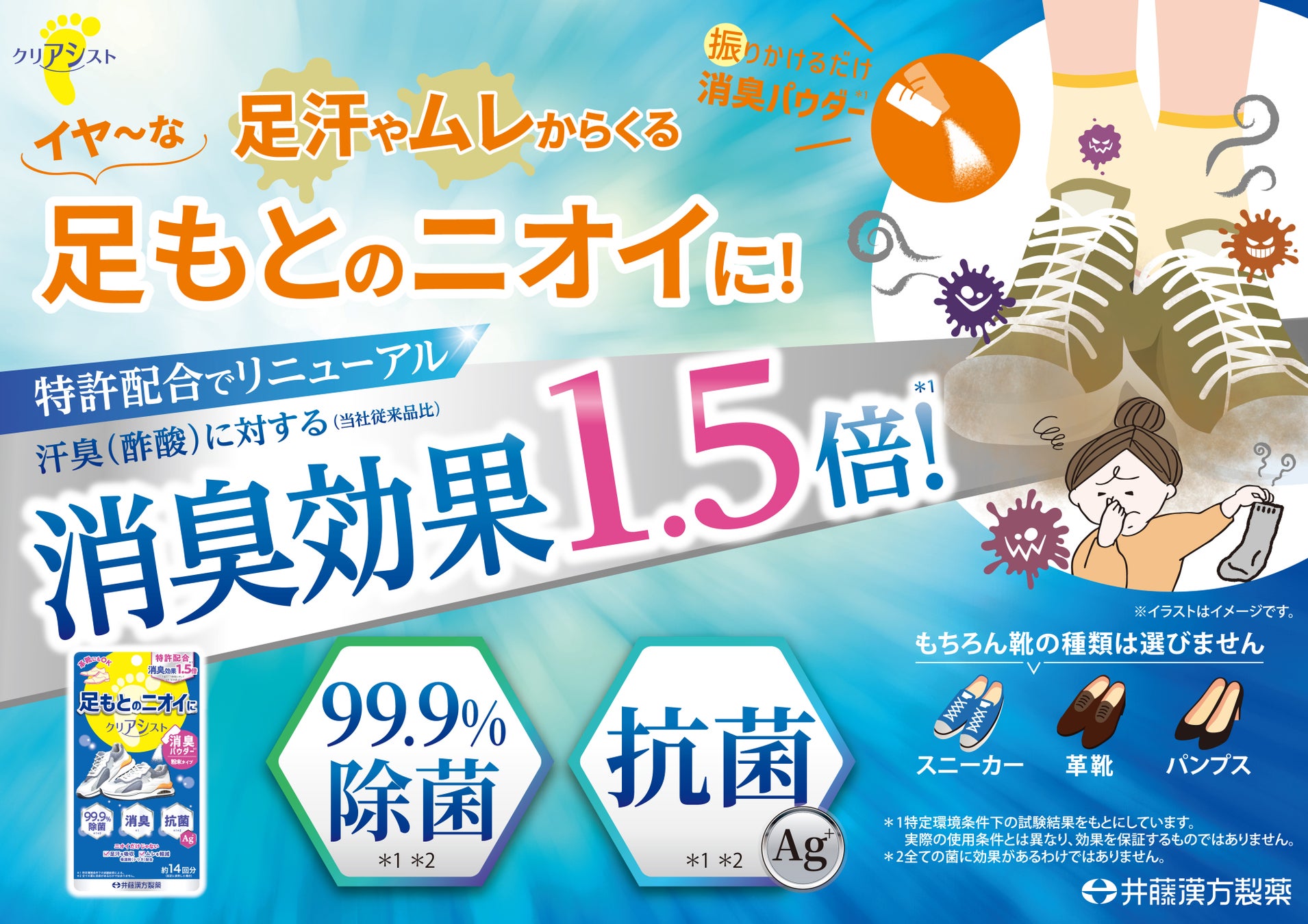 健康食品をはじめ医薬品、医薬部外品などを製造・販売する井藤漢方製薬株式会社(本社:大阪府東大阪市、代表取締役社長:井藤竜生)は、特許配合で汗臭(酢酸)に対して消臭*¹効果がさらにパワーアップリニューアルした靴の消臭パウダー【クリアシスト】を2025年2月3日(月)より新発売いたします。